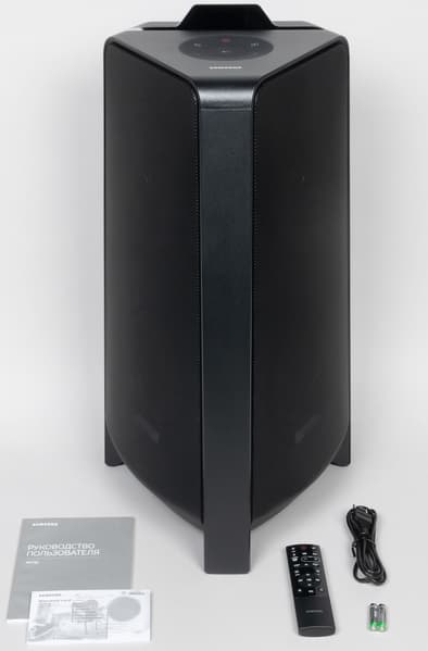 В комплект поставки входят сама колонка, пульт дистанционного управления и батарейки к нему, кабель питания и документация.