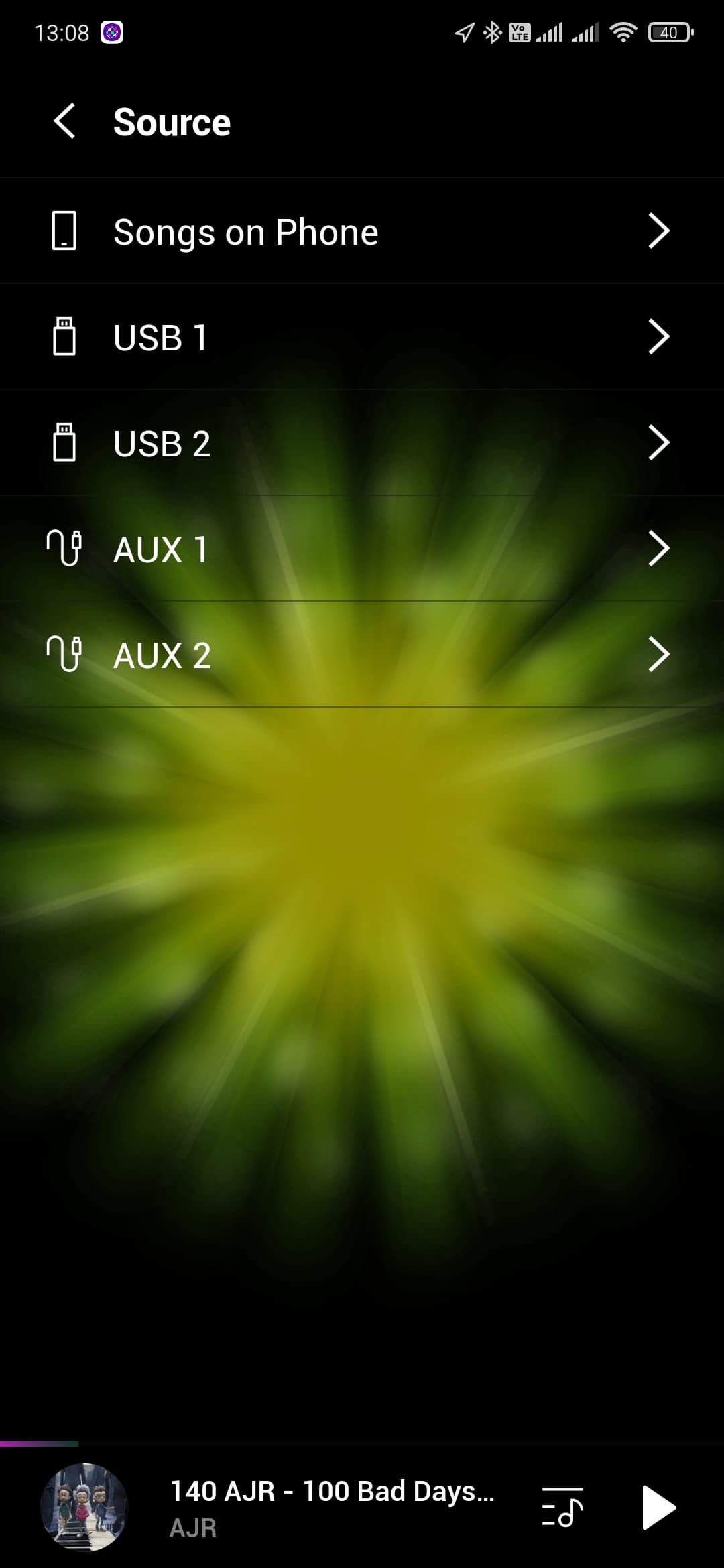 На вкладке Source можно выбрать источник звука. В частности, можно воспользоваться встроенным плеером. Обилием возможностей он не блещет — в частности, вместо тегов в списке демонстрируются названия файлов, что сильно ограничивает возможности сортировки и создания библиотеки. Что интересно, со смартфона можно управлять и воспроизведением с USB-накопителя, причем приложение даже отображает имена файлов.