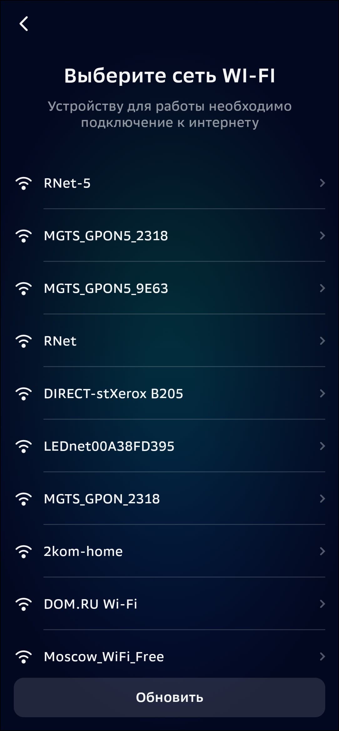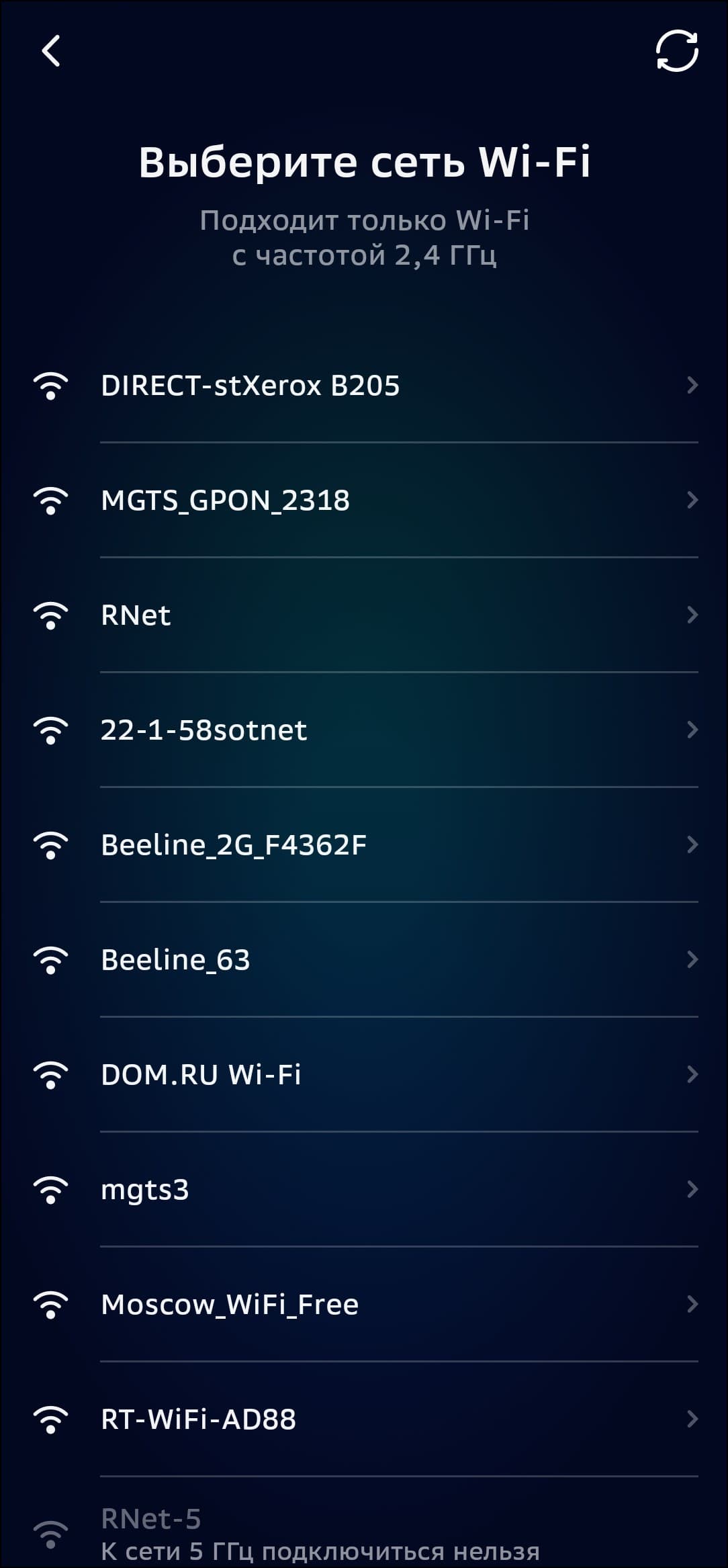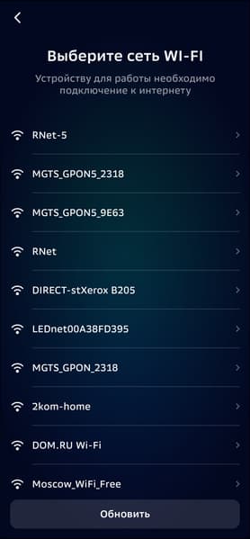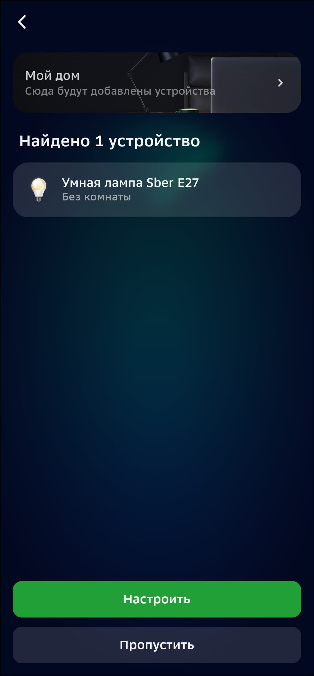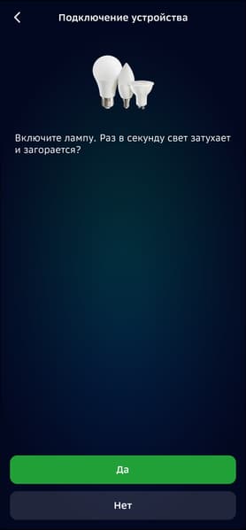 Далее находим наше «умное» устройство в меню, выбираем сеть, включаем лампочку и дожидаемся ее мигания — приложение проводит нас через все этапы и дает четкие инструкции.