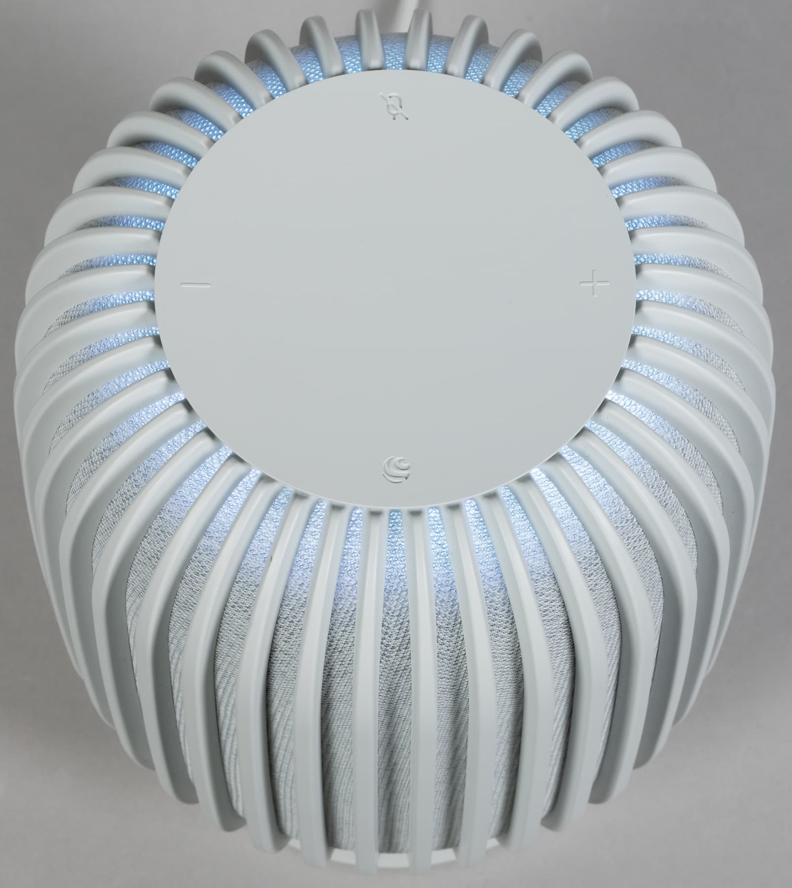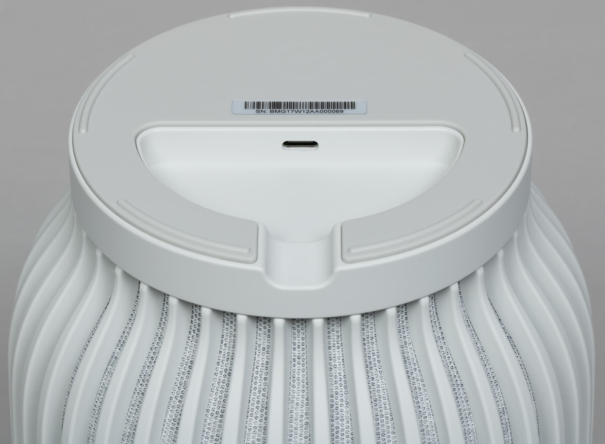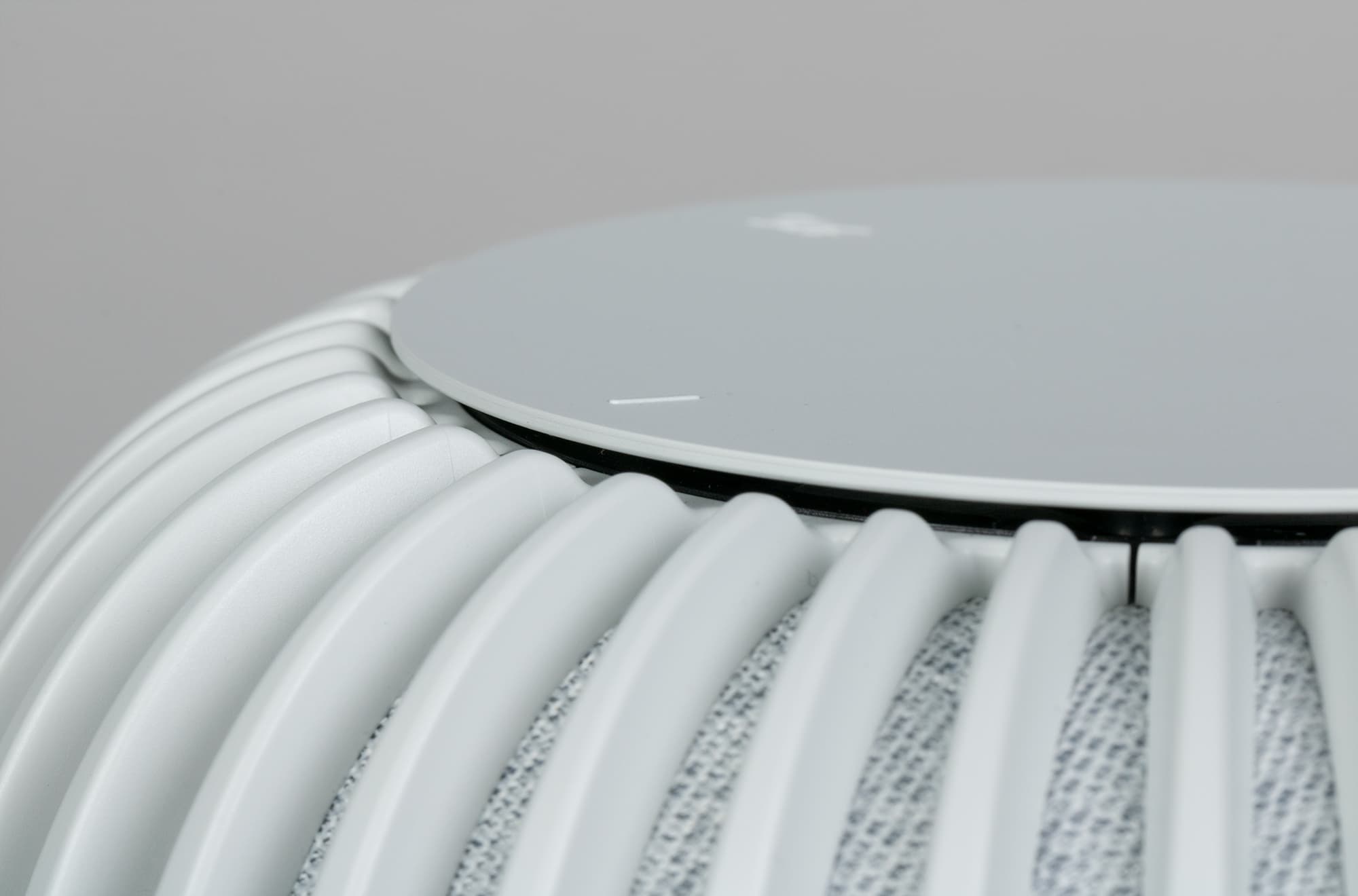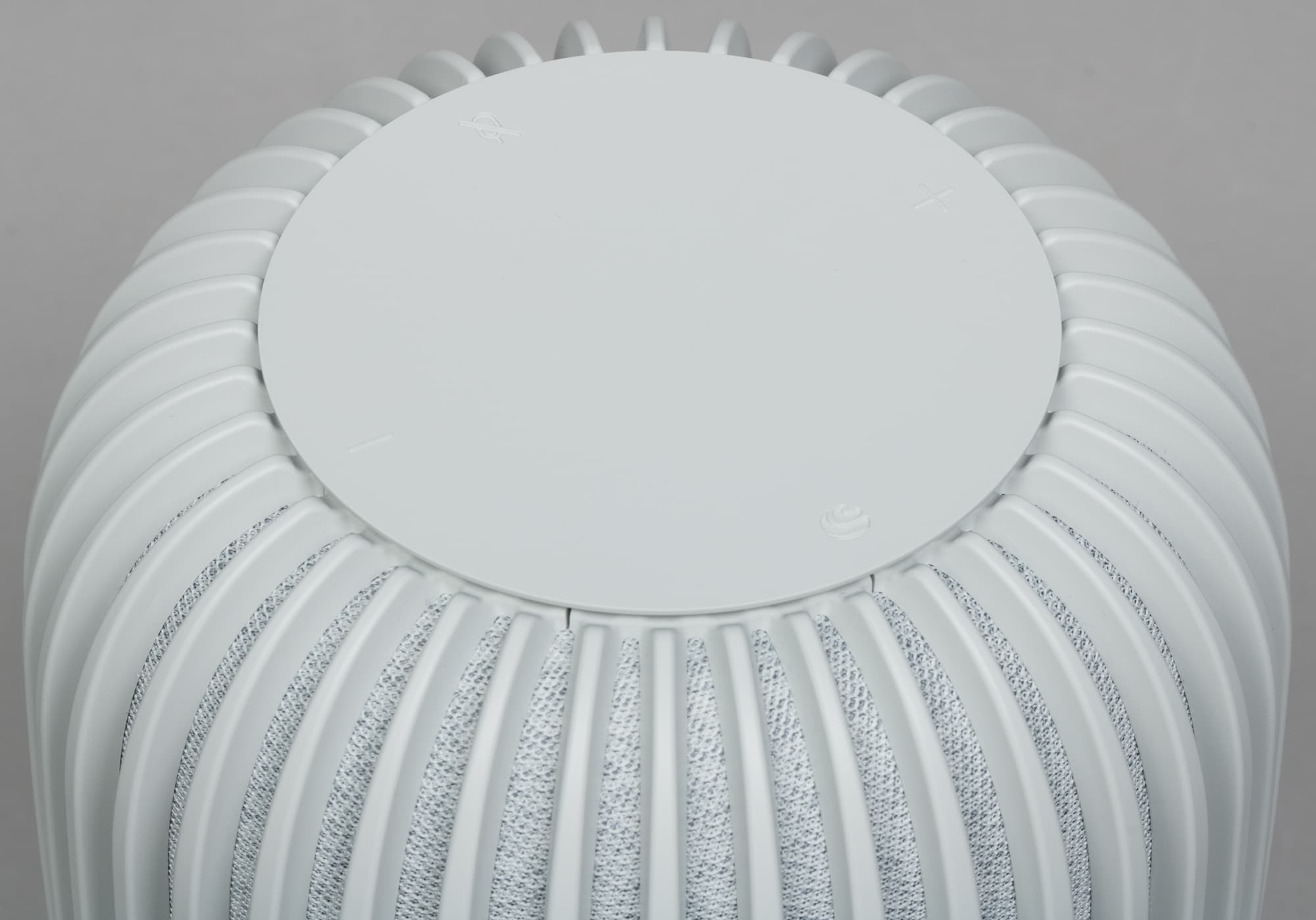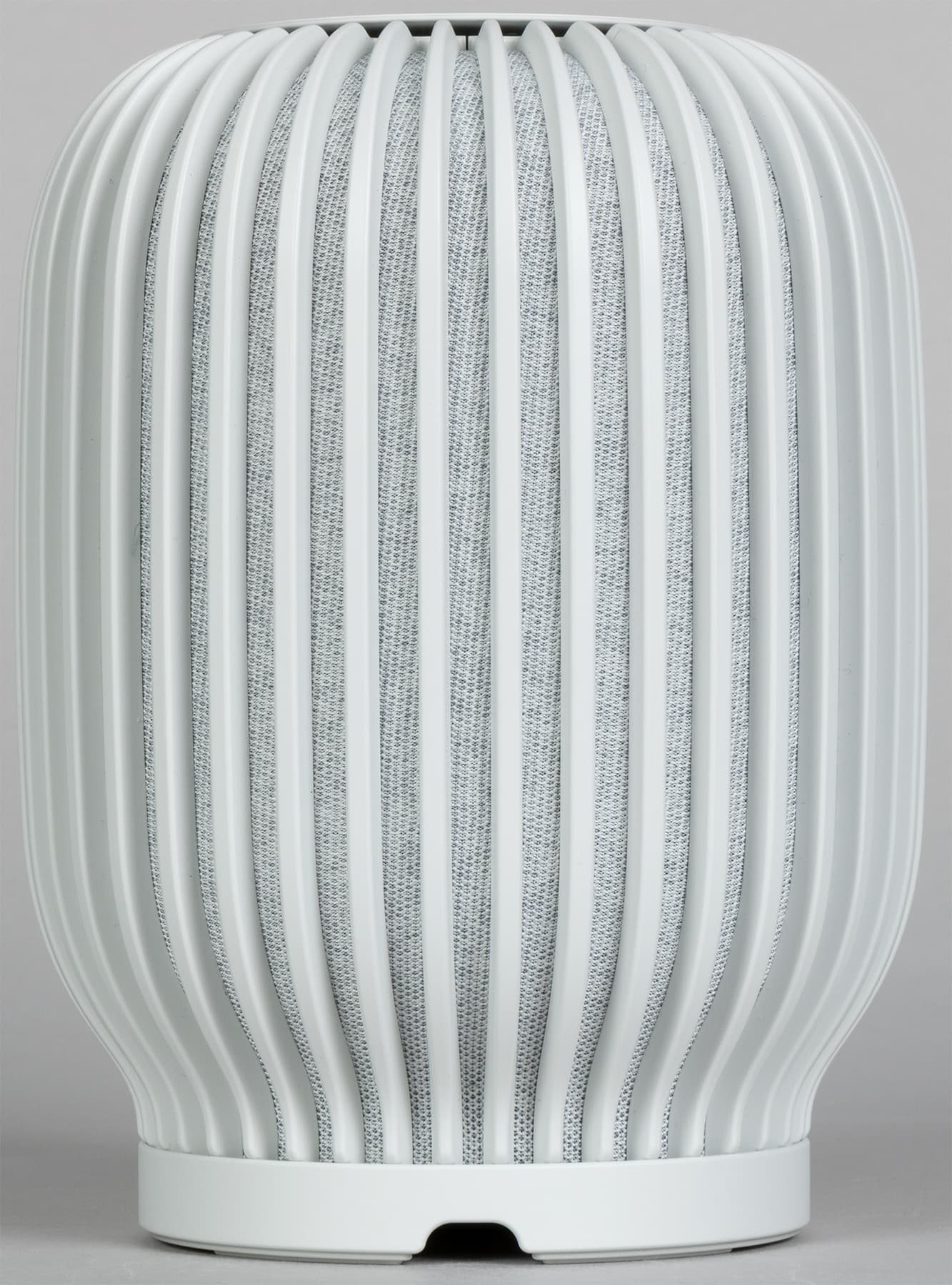 Форма у устройства весьма оригинальная: бочкообразная и с ребрами вдоль корпуса, под которыми виднеется слой ткани. Выглядит интересно — напоминает то ли кактус, то ли турбодефлектор системы вентиляции. Вот только очищать многочисленные ребра может быть сложновато. Других декоративных или иных элементов на боковых поверхностях корпуса нет, лишь в основании виднеется выемка для кабеля питания.