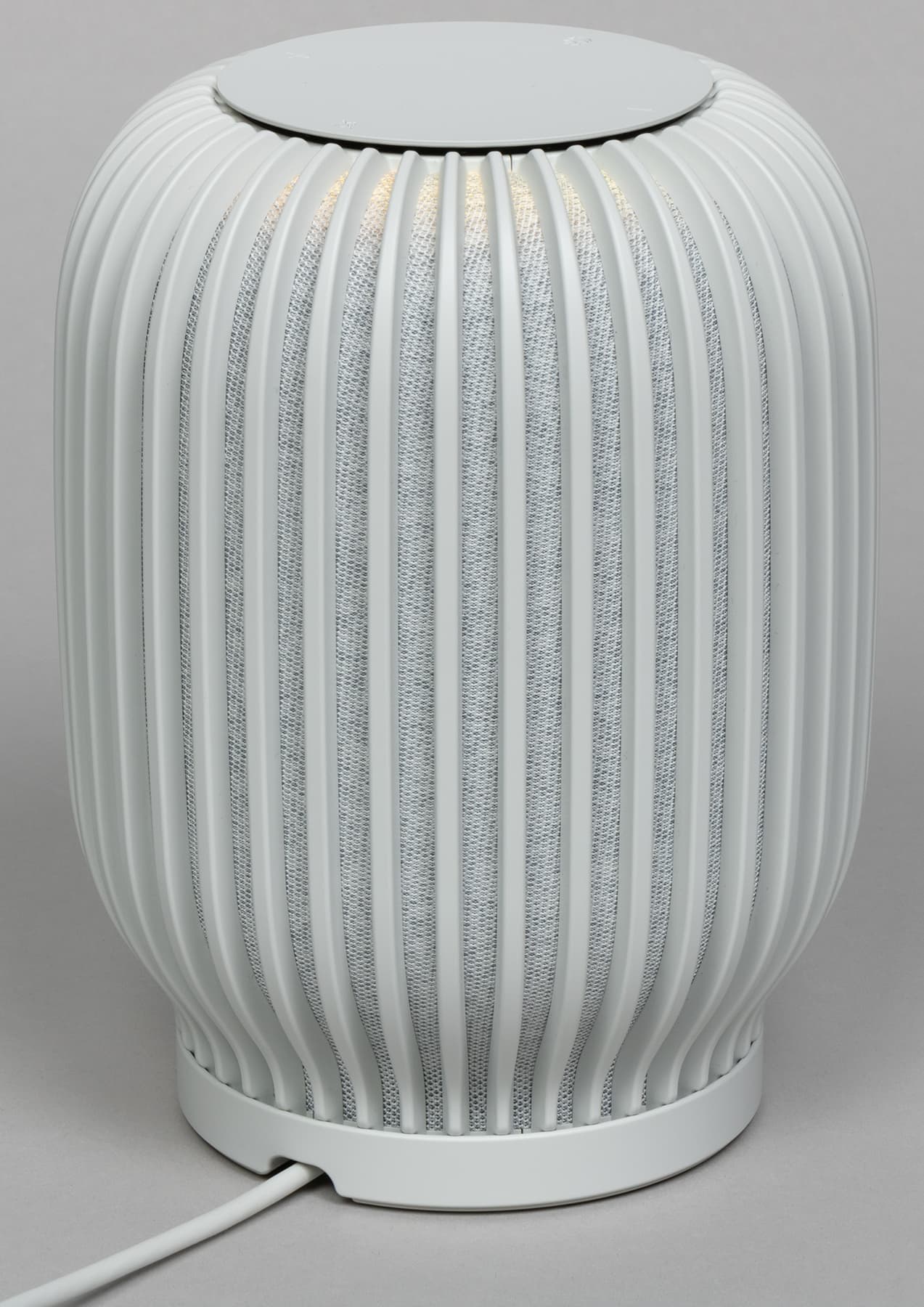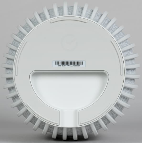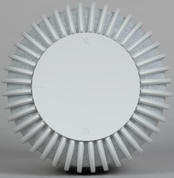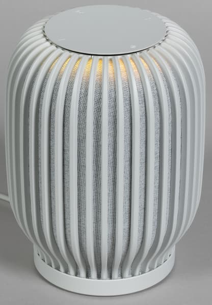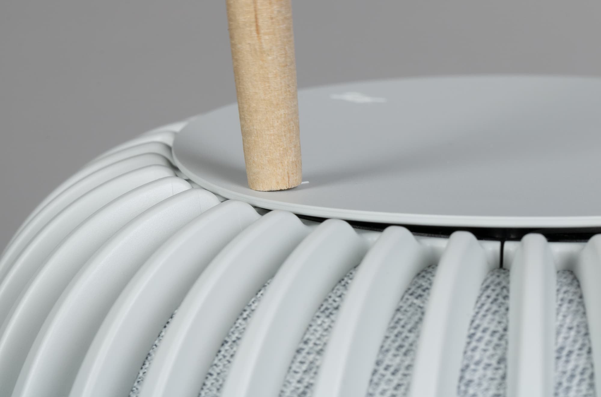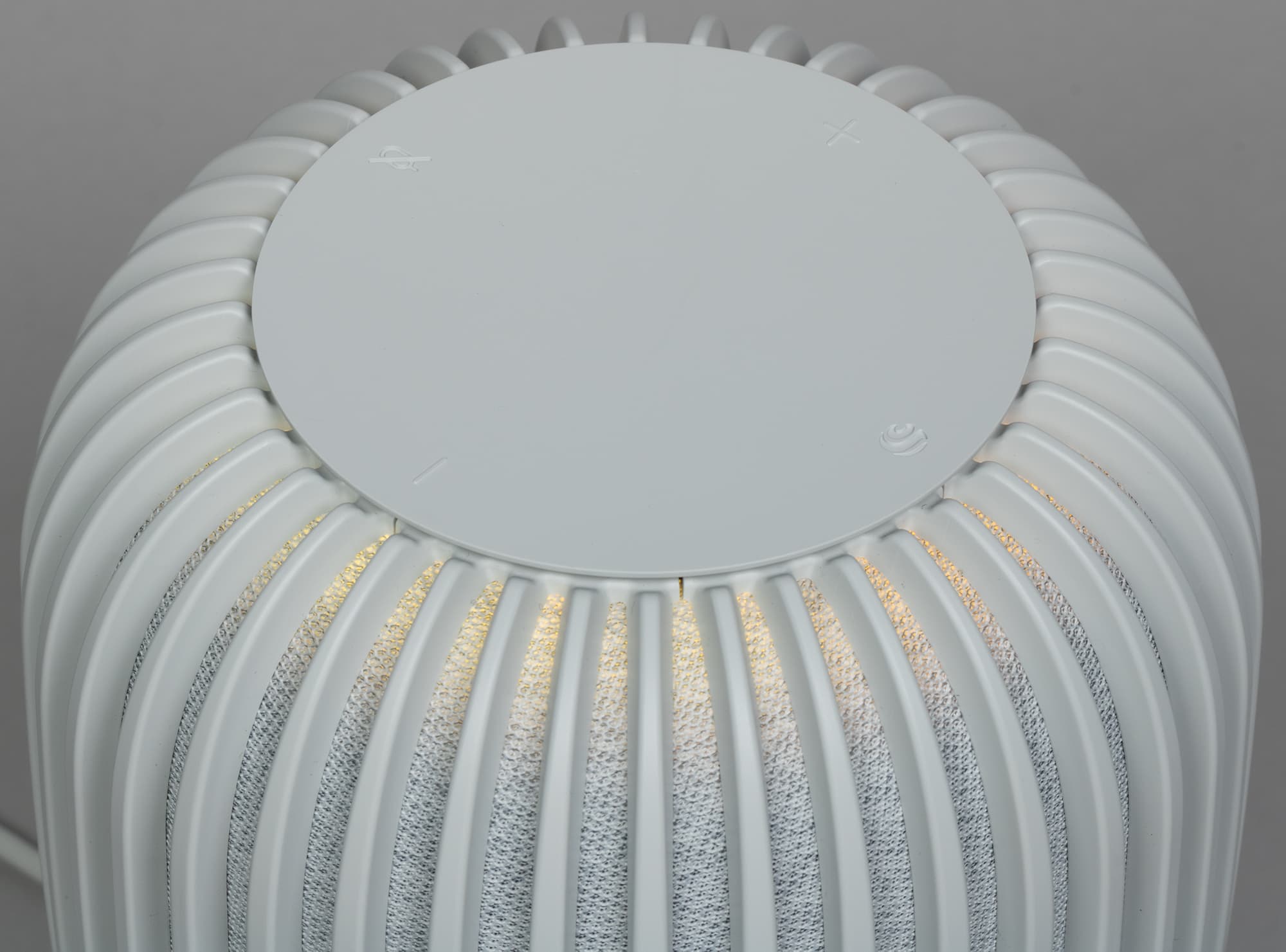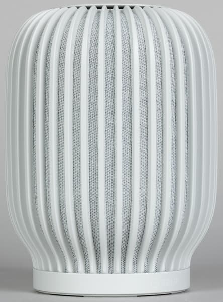 Форма у устройства весьма оригинальная: бочкообразная и с ребрами вдоль корпуса, под которыми виднеется слой ткани. Выглядит интересно — напоминает то ли кактус, то ли турбодефлектор системы вентиляции. Вот только очищать многочисленные ребра может быть сложновато. Других декоративных или иных элементов на боковых поверхностях корпуса нет, лишь в основании виднеется выемка для кабеля питания.