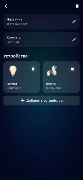 Остается как-то назвать нашу группу — и готово. В нашем случае группа «Тестовый свет» названа так не случайно. Дело в том, что по команде «выключи свет» голосовой ассистент выключает все световые приборы, вне зависимости от того, создана ли соответствующая группа.