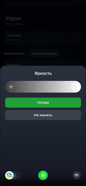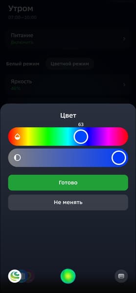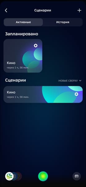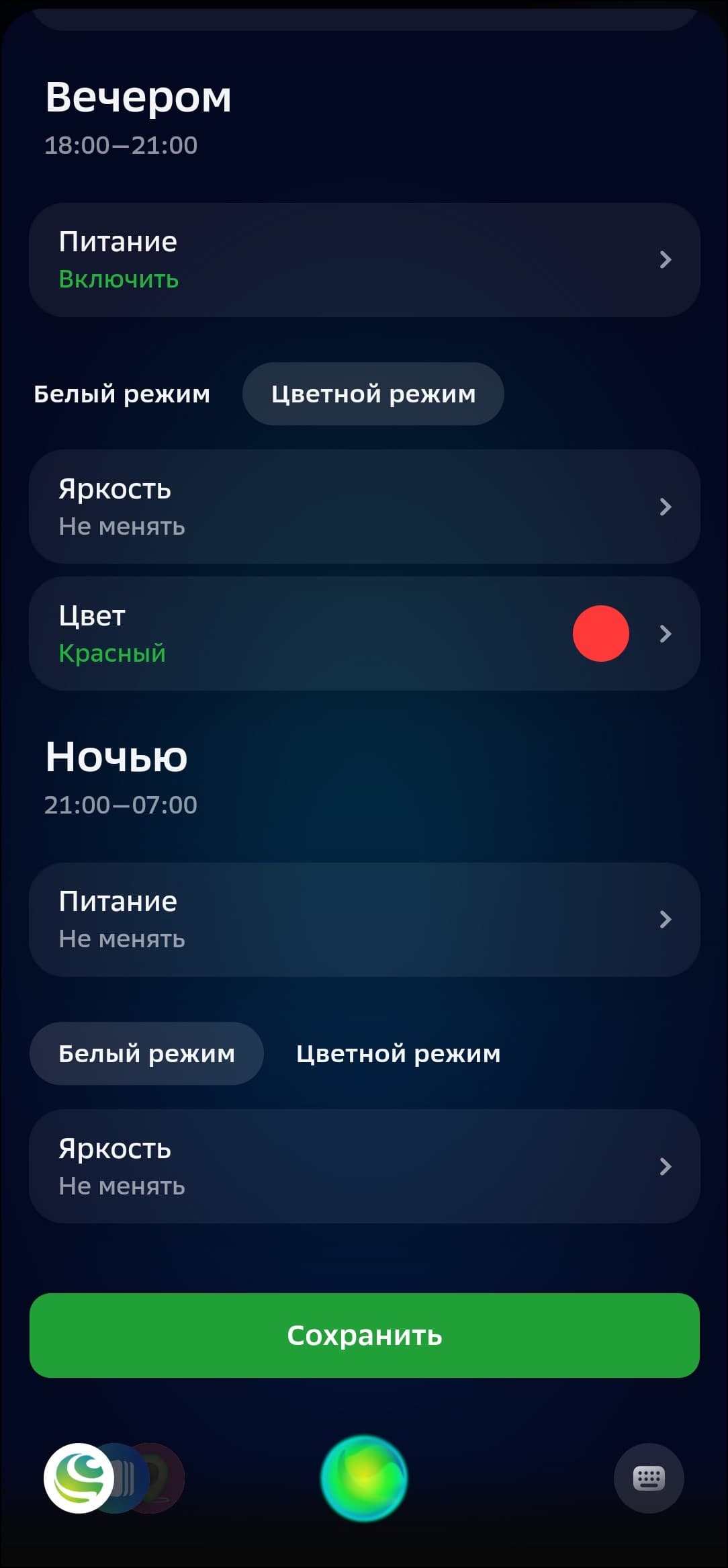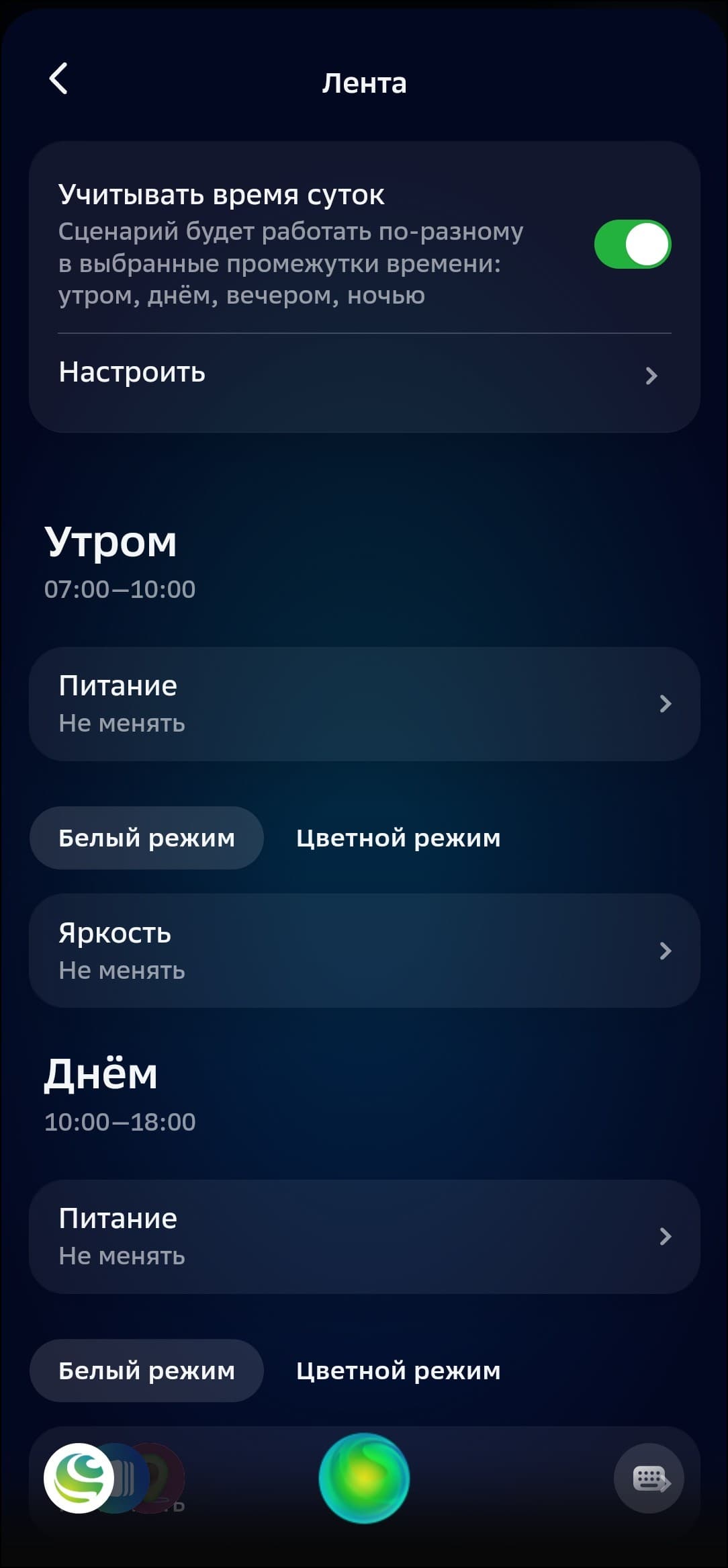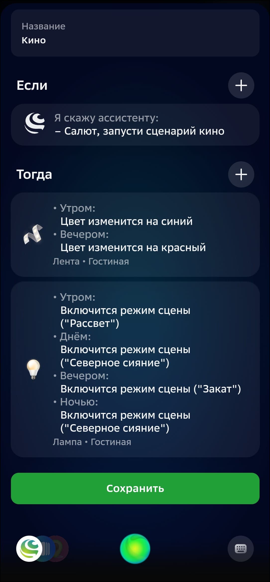 В нашем сценарии «Кино», например, утром лампа включает режим «Рассвет», днем — «Северное сияние», вечером — «Закат»... ну и так далее, всё видно на скриншотах ниже.