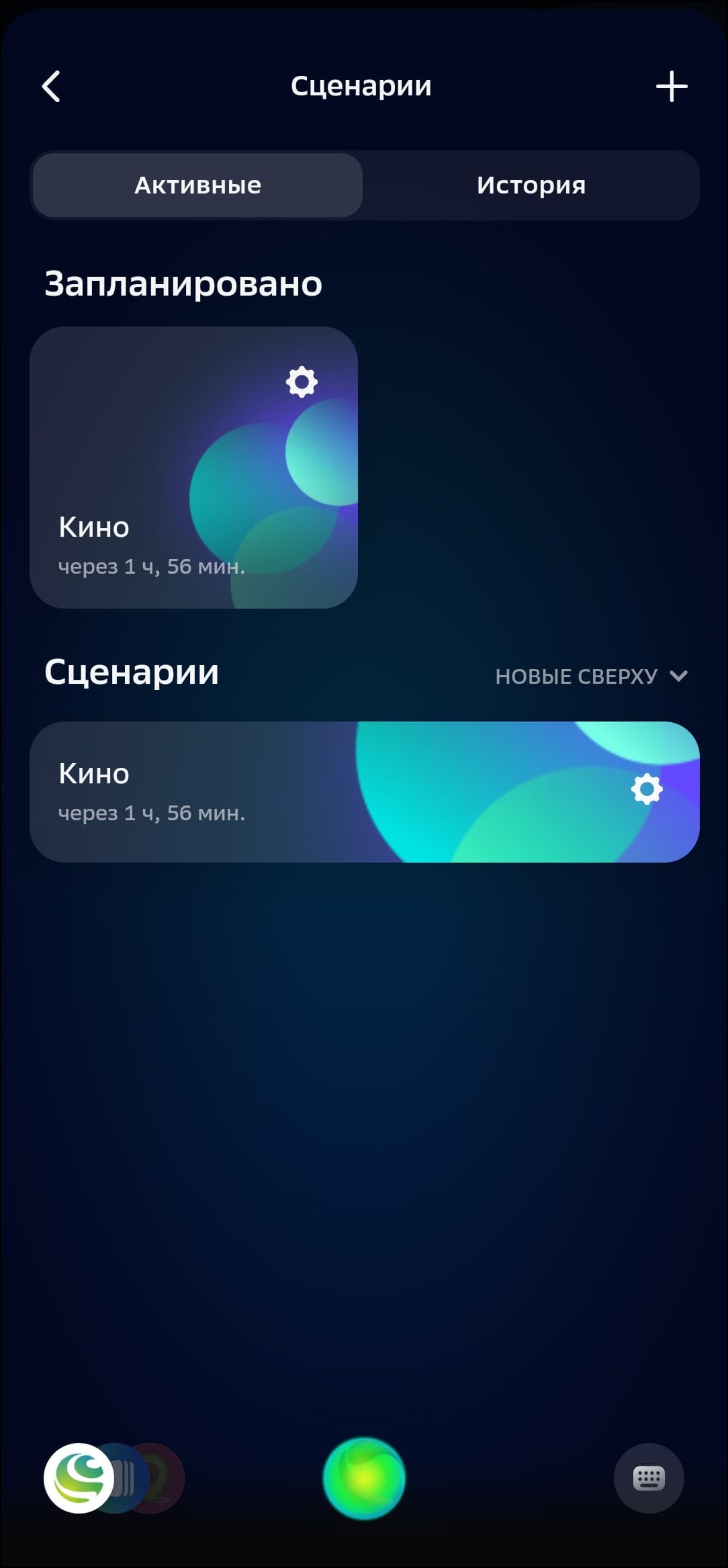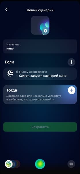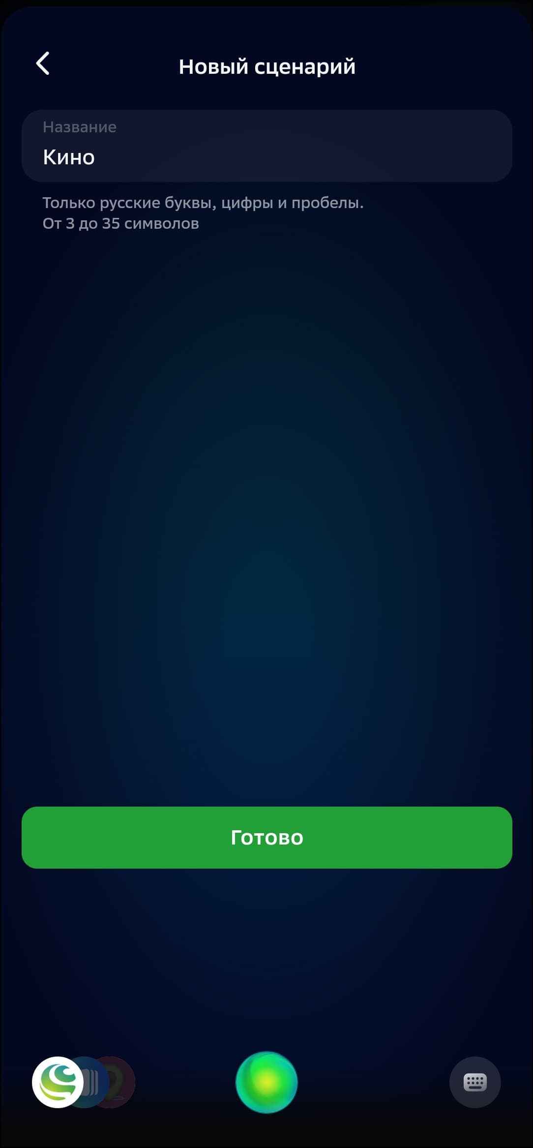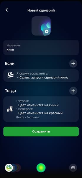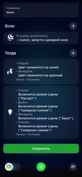 Присутствует и возможность создания последовательностей действий — сценариев. Их выполнение можно привязать к какой-нибудь фразе, либо запускать непосредственной командой «Салют, запусти такой-то сценарий», также есть опция запуска в назначенное время.
