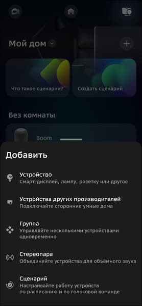 Устройства можно объединять в группы. Для этого в меню добавления кликаем на пункт «группа», далее выбираем дом и комнату, следом — нужные устройства.