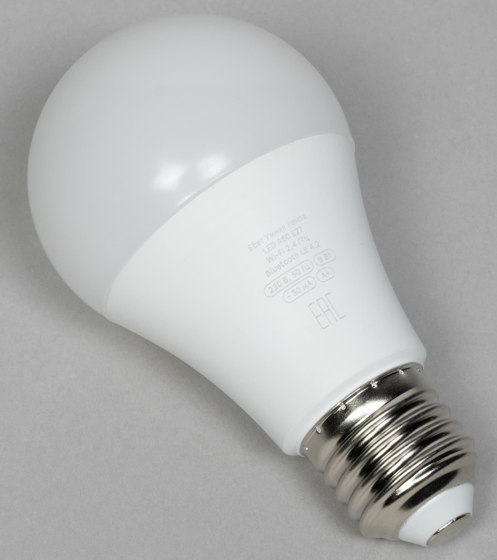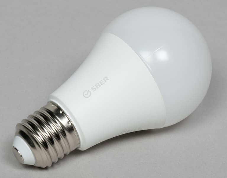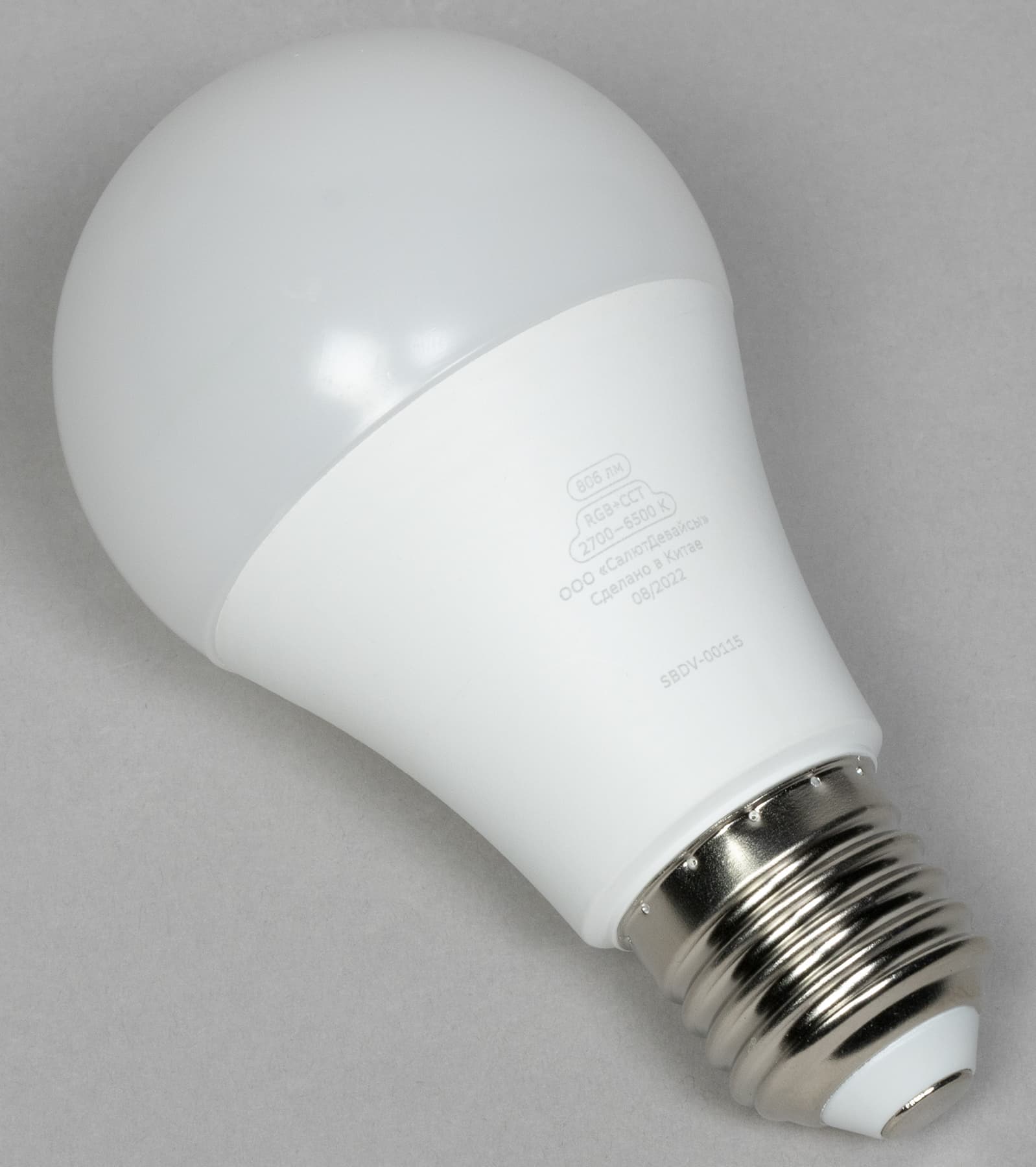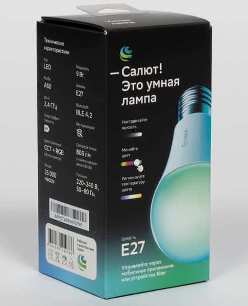 На лицевой стороне коробки отдельно подчеркнуто, что лампа позволяет выбирать яркость свечения, цветовую температуру белого свечения или один из 16 млн вариантов цветного. Внутри мы обнаружили лампу стандартного дизайна под патрон E27. Сбоку на корпус нанесен логотип «Сбера».