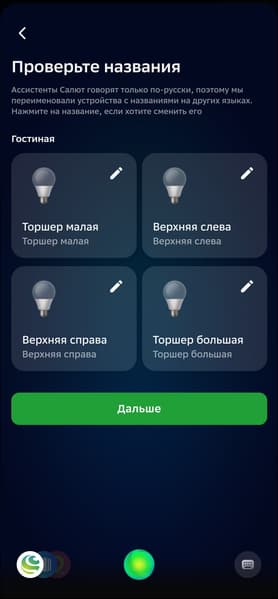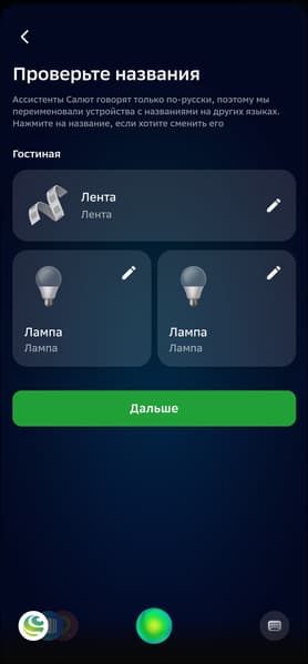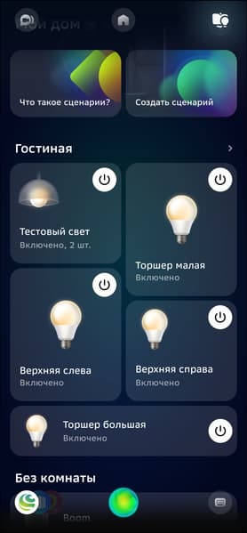 Названия приборов «подтягиваются» из приложения стороннего производителя, что удобно. У нас лампы были названы в соответствии с расположением. Собственно, готово — голосовой ассистент теперь может включать и выключать освещение, менять его яркость и цвет — в общем, делать всё необходимое.