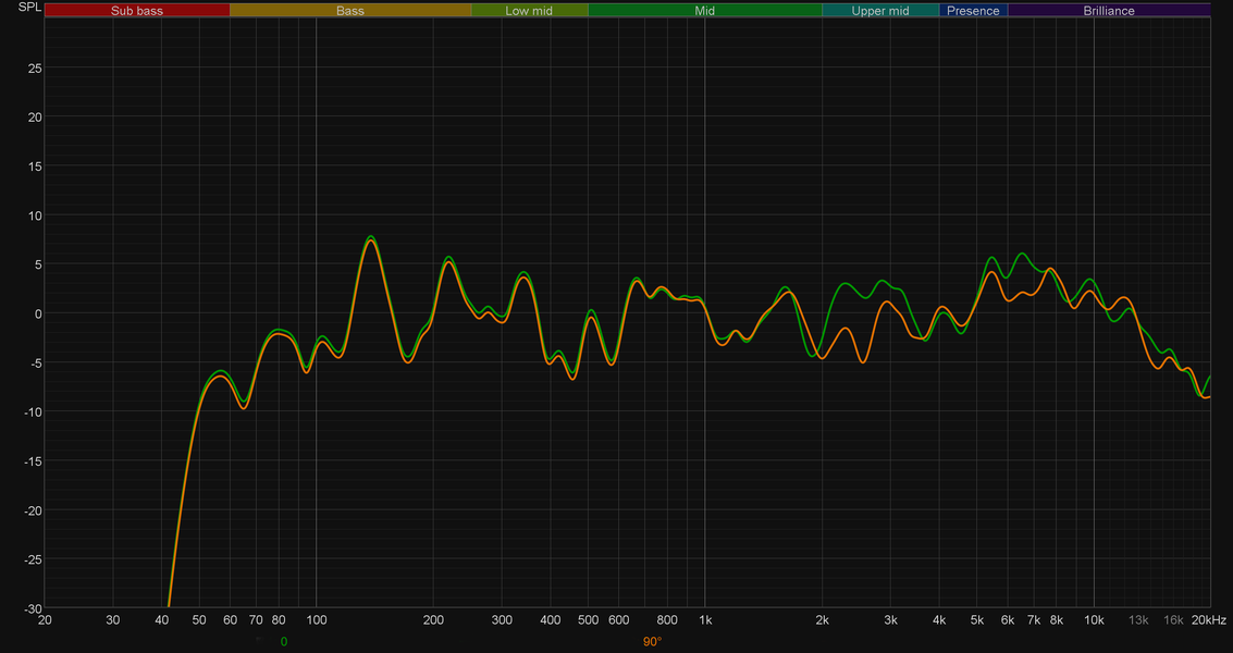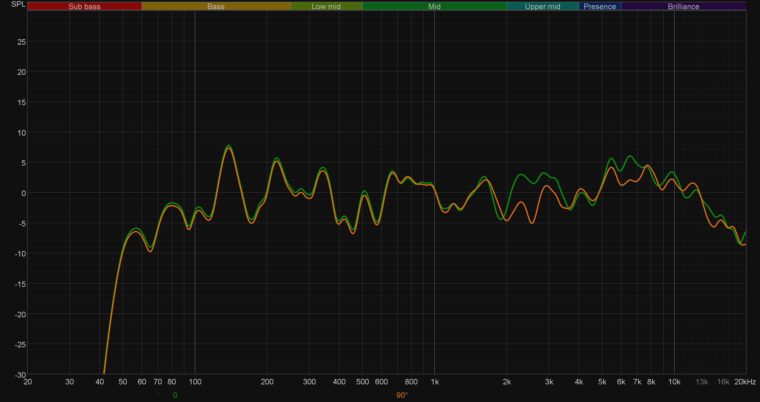 Заявлено распространение звука на 360°, что мы просто не могли не проверить. При повороте колонки на 90° относительно микрофона график пусть и незначительно, но всё же меняется — вероятнее всего, это связано с тем, что внутри конструкция не является полностью симметричной: к примеру, пассивные излучатели смотрят не на все четыре стороны, а только в две.