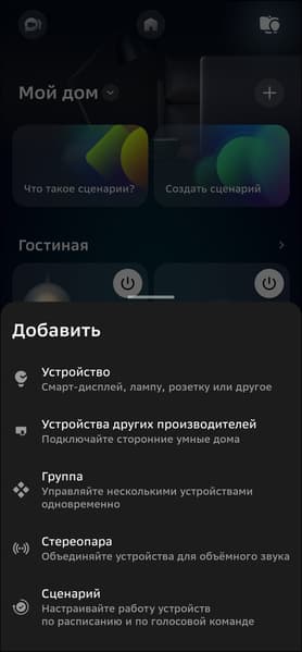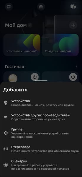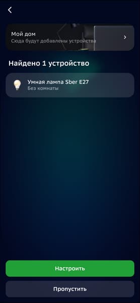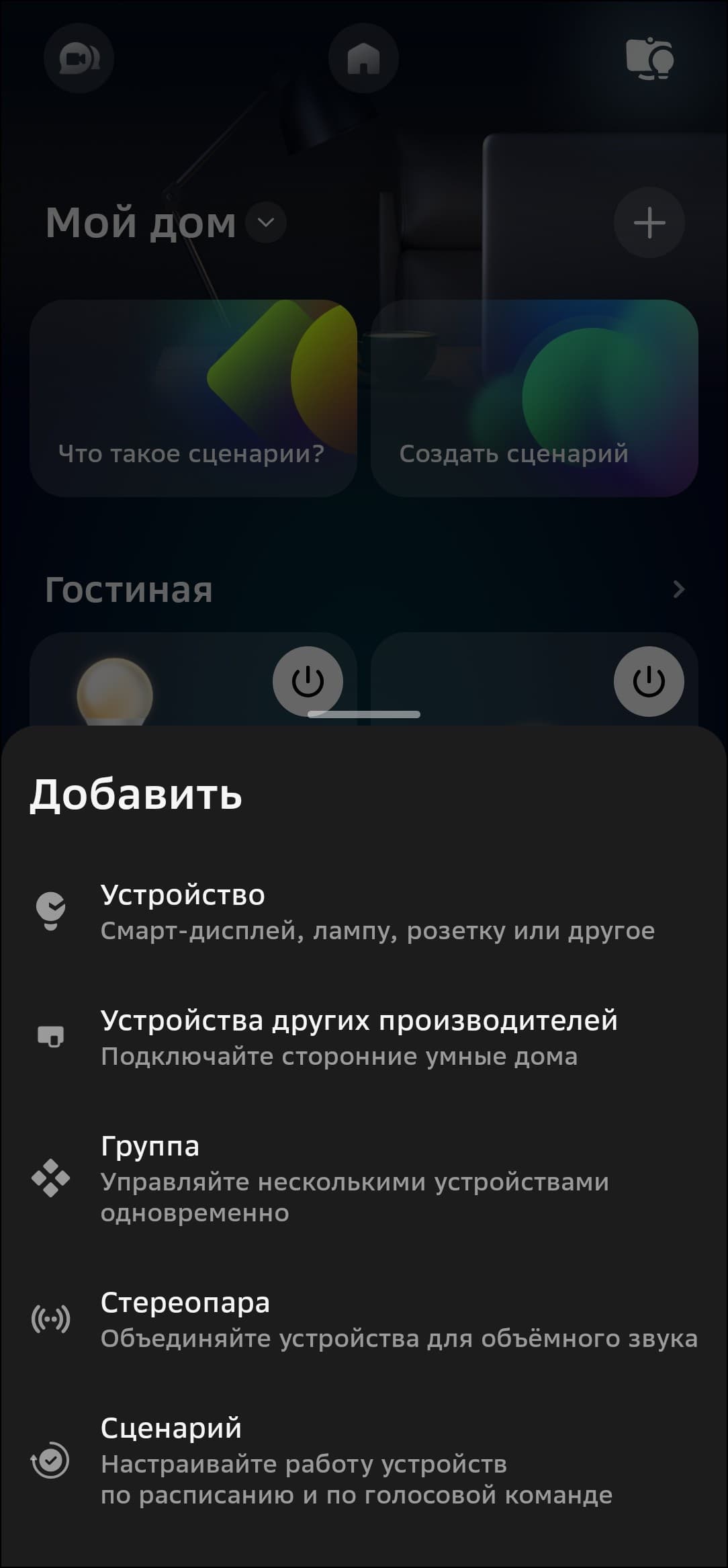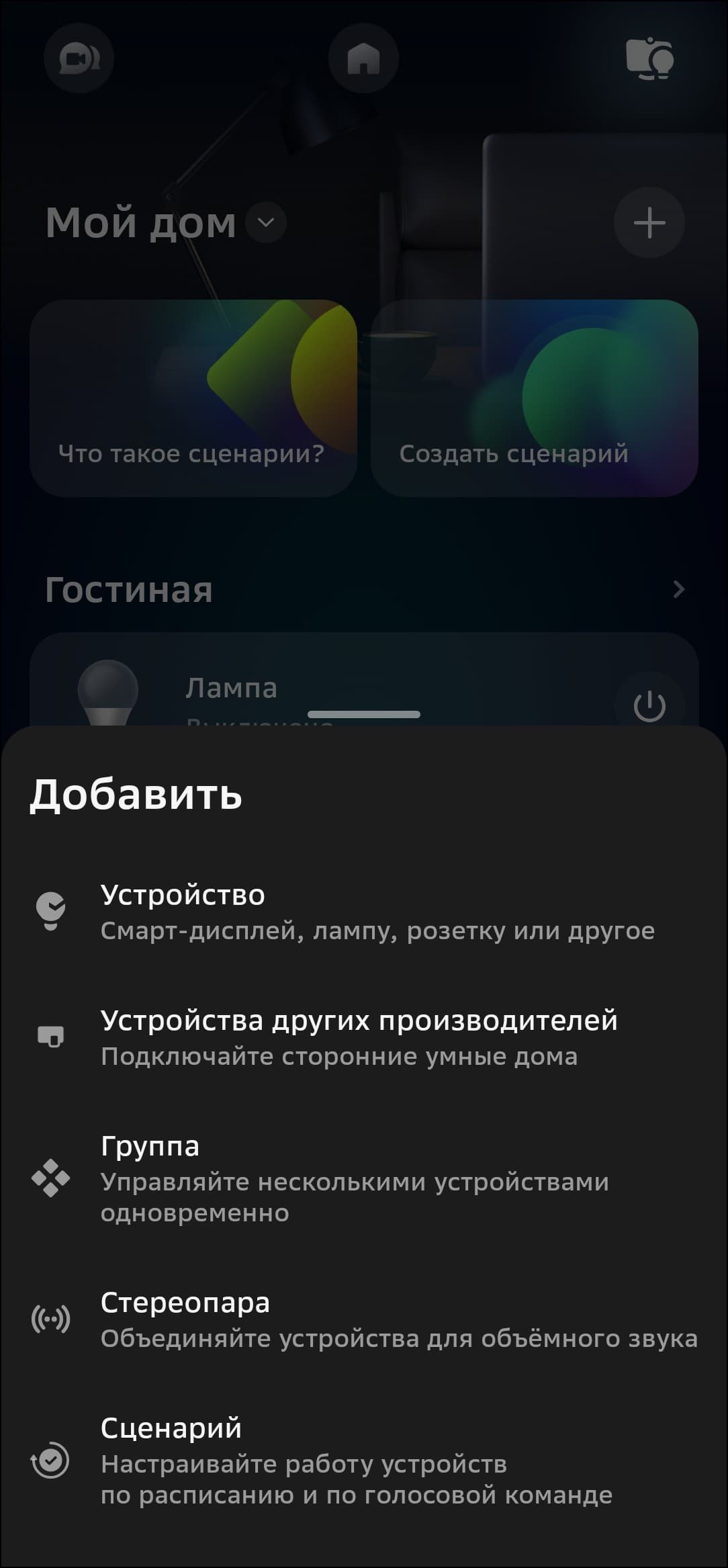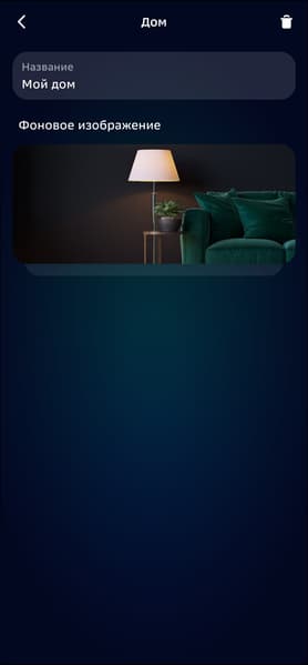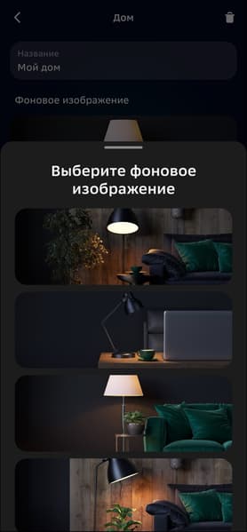 Следующий этап настройки — подключение приборов «умного» дома. Фирменная смарт-лампа пока идет в комплекте с колонкой, с нее и начнем. Но для начала настроим сам дом: можно изменить его имя, а также выбрать одно из фоновых изображений. Ну и если планируется использовать устройства «Сбера» в разных домах — можно добавить все в свой аккаунт, чтобы потом не путаться и иметь возможность обращаться к ним в зависимости от расположения. Заодно похвалим внешний вид приложения — выглядит оно крайне приятно. Жмем на плюс в правом верхнем углу — открывается меню добавления всякого-разного, выбираем «устройство».