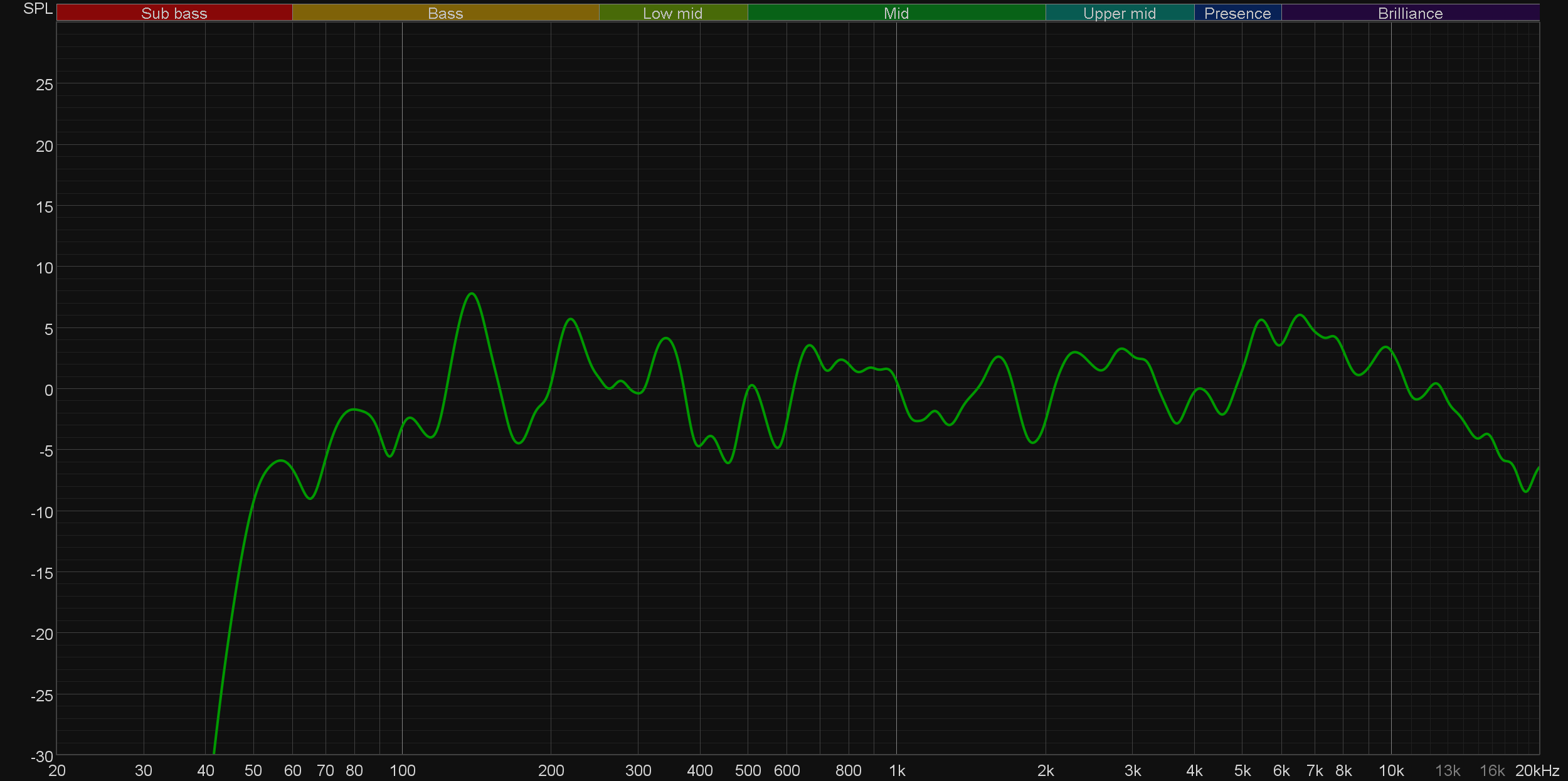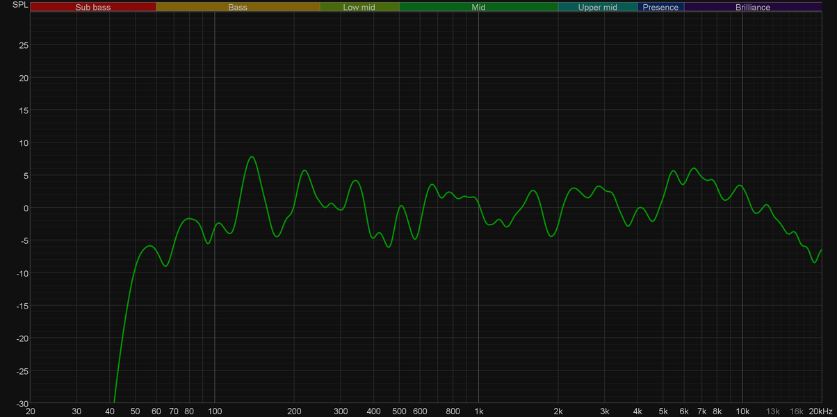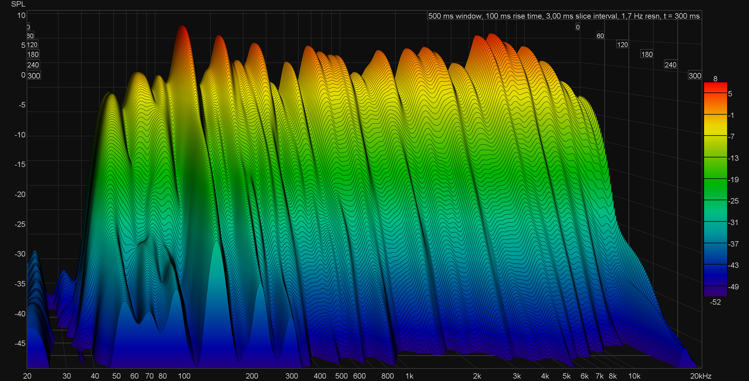 По графику кумулятивного затухания спектра (он же «водопад» или waterfall) хорошо заметно, что бас очень «гулкий», пики простираются от 50 и аж до примерно 300 Гц — резонатор внутри корпуса и пассивные излучатели делают свое дело, но привносят в звучание вот такие вот особенности.