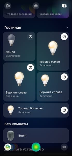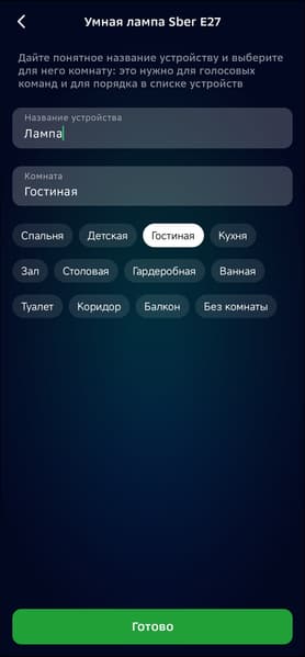В целом — готово, на всё уходит меньше минуты. Добавляем расположение: дом и комнату. Благодаря этому мы можем говорить «выключи лампу в гостиной» — выключится именно свет в гостиной, а такая же лампа с таким же именем на кухне, например, продолжит гореть. В общем, организовать всё можно удобно и логично — как и в любом приличном приложении для взаимодействия с «умным» домом. Управлять подключенным устройством можно как голосовыми командами, так и с его вкладки в приложении — тут уж как удобнее в конкретной ситуации.