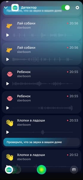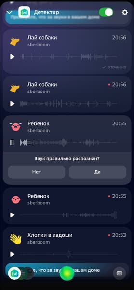 Ну а дальше всё просто — находим записи соответствующих звуков, включаем их в стоящих неподалеку от SberBoom колонках. С задержкой примерно в полминуты система оповещает нас о появлении шума с помощью push-уведомления. При этом лай и плач распознаются корректно — без путаницы. Далее в приложении можно послушать запись того, что именно происходит, чтобы принять решение о дальнейших действиях. А заодно немного помочь развитию системы указав, правильно ли распознан звук.