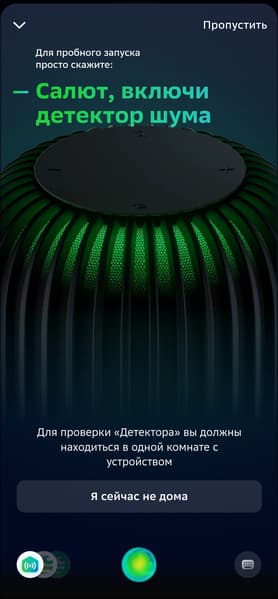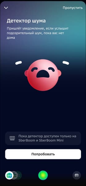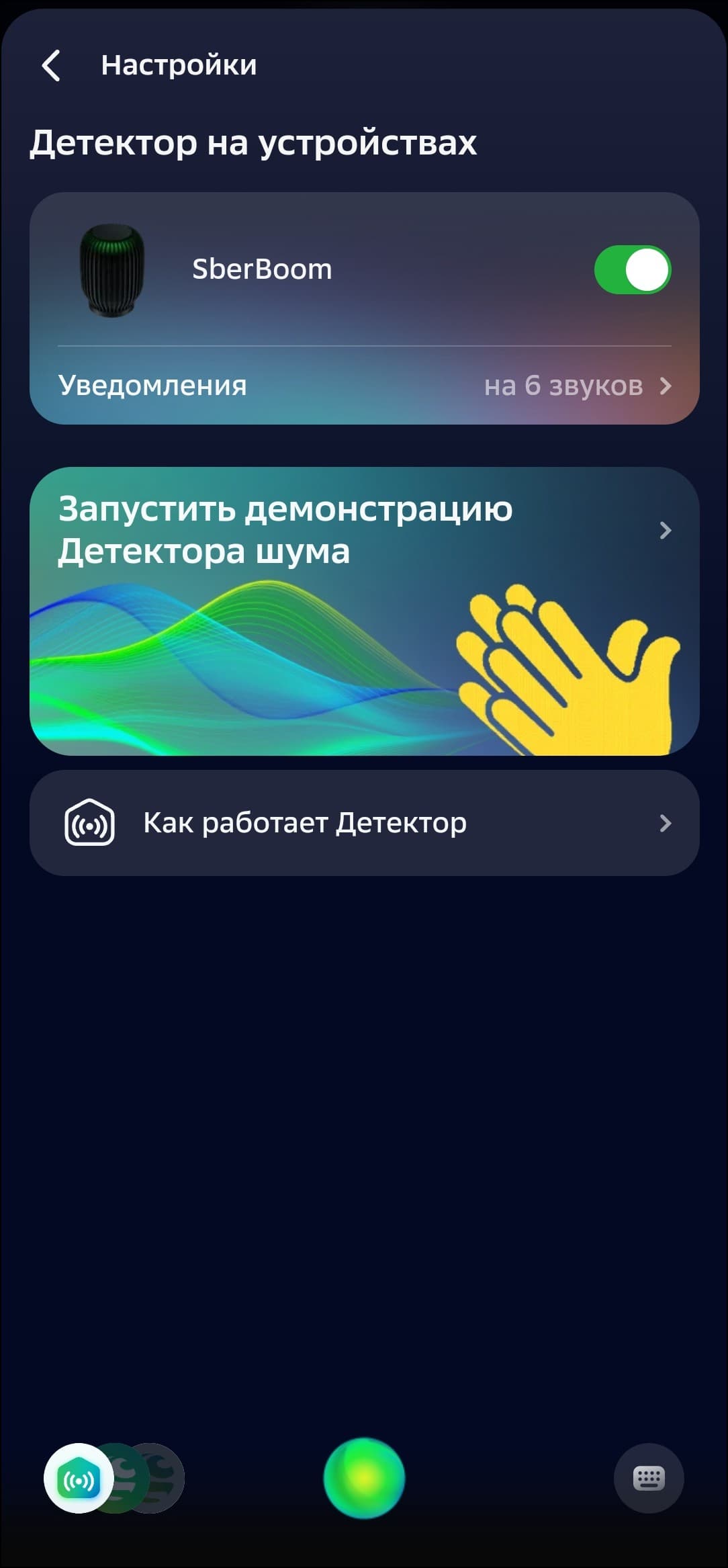 Ну а если говорить про совсем уж оригинальные возможности SberBoom, то начинать явно следует с датчика шума. Запущен он пока в тестовом режиме, доступен только для устройств под управлением Android, но уже вполне работоспособен. Вкратце расскажем, что это и для чего может быть нужно. Пользователь включает режим в приложении или голосовой командой, после чего уходит из дома. Далее устройство замеряет уровень окружающего шума и берет его в качестве базового, если уровень становится выше этого порога — система срабатывает и оповещает пользователя о том, что что-то происходит в его отсутствие.
