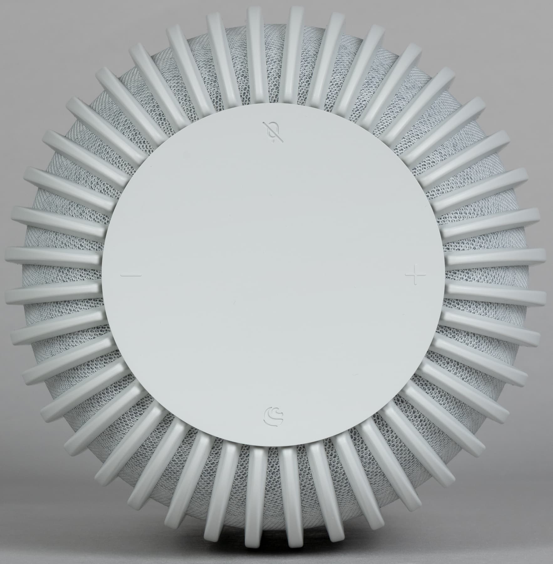 Сверху размещена круглая панель управления с четырьмя клавишами, нажатия на которые осуществляется путем ее наклона — на нее мы еще посмотрим чуть позже. Пространство под панелью подсвечивается.