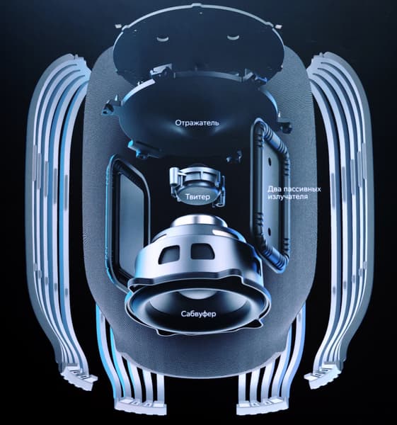 Разработчики анонсируют уникальный дизайн акустической камеры, конструкция которой даже показана на коробке с устройством. Как можно заметить, внутри SberBoom размещены сабвуфер и твитер, отражатель и два пассивных излучателя, позволяющие рассчитывать на выраженный НЧ-диапазон.