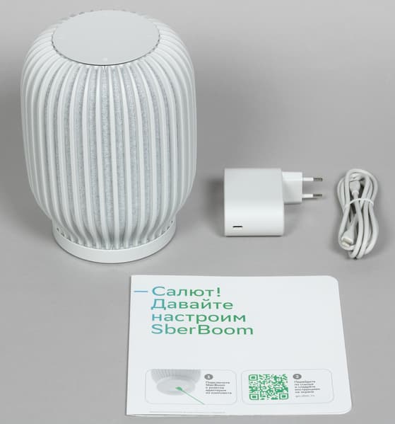 В комплект поставки помимо самого устройства входят, краткая инструкция, блок питания и подключаемый отдельно кабель USB-C — USB-C. Последнее порадовало особо — в случае необходимости кабель легко заменить, купив совместимый в удобном магазине и без длительных поисков. Также при покупке SberBoom и SberBoom Mini пользователи получают возможность подключить 60 дней подписки СберПрайм за 1 ₽. В нее входят доступ к музыкальному стриминговому сервису «Звук», онлайн-кинотеатру Okko и так далее.