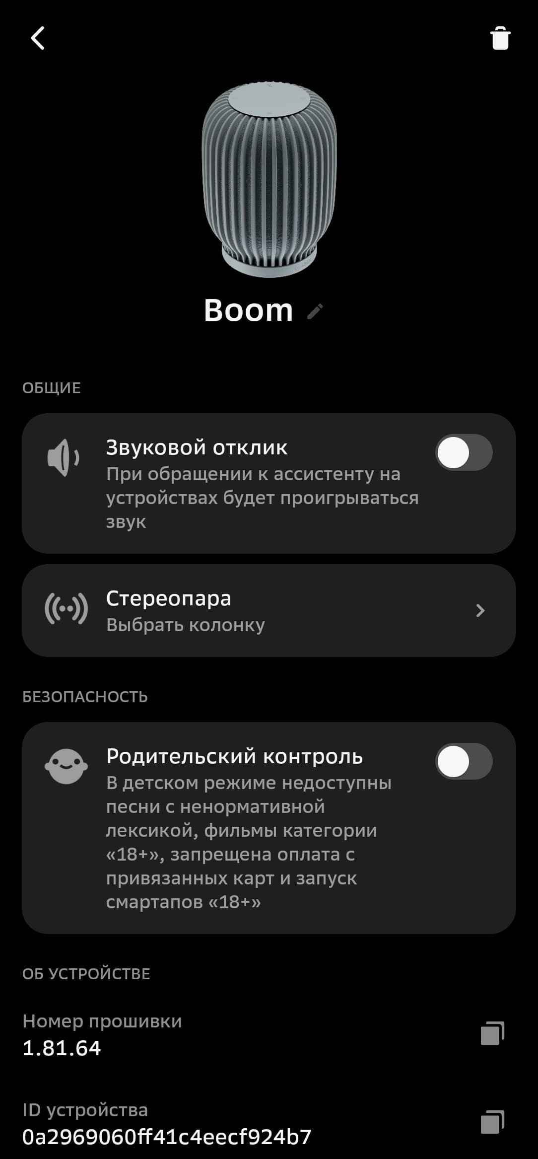 На вкладке колонки можно поменять имя, а также добавить ее в стереопару — две SberBoom вместе могут создавать выраженный стереоэффект, ну и в качестве «бонуса» увеличится общая мощность системы. Нелишним будет проверить и настройки профиля в экосистеме «Сбера», с которой колонка очень глубоко интегрирована.