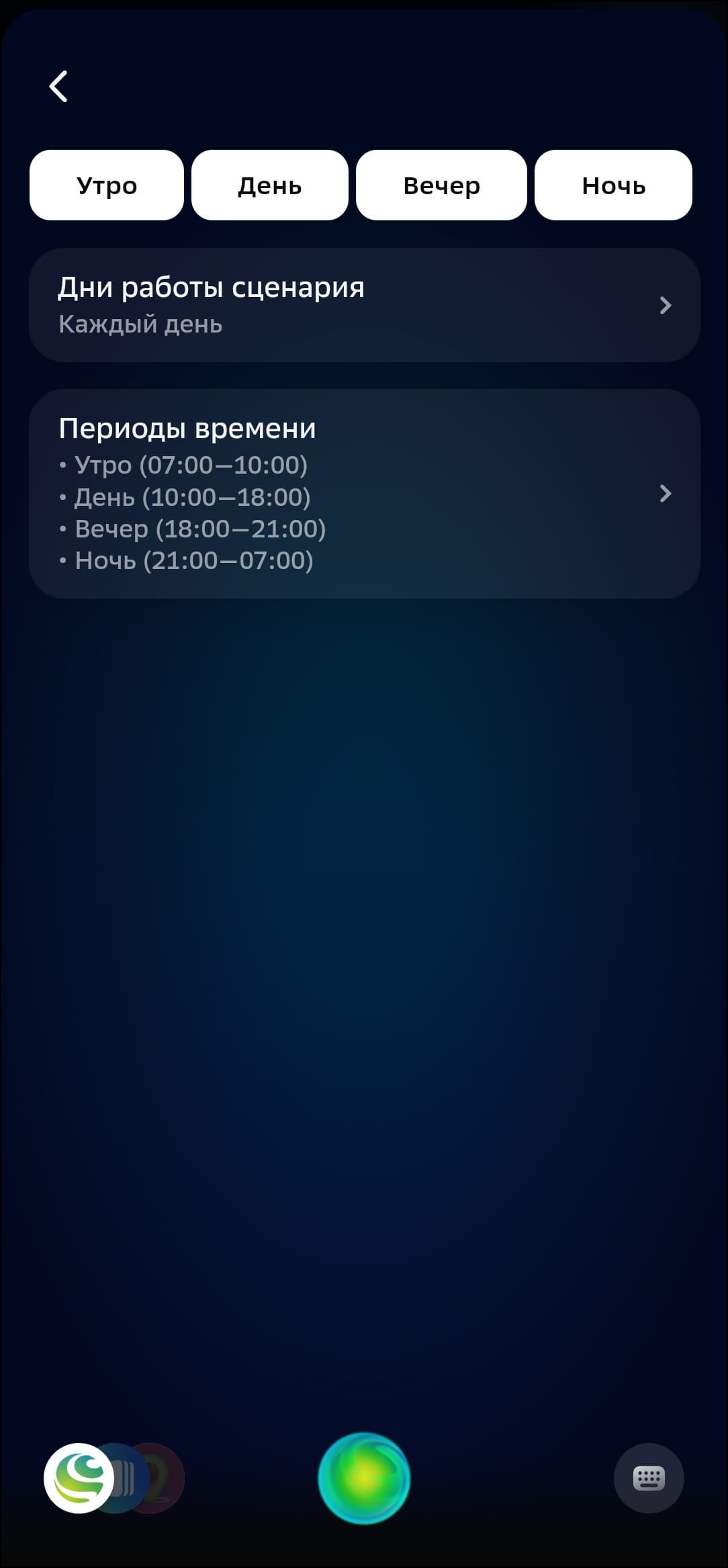 Отдельно надо отметить возможность изменять параметры выполнения сценария в зависимости от времени суток: утро-день-вечер-ночь. Границы периодов, естественно, настраиваются. Полезная опция, которой немного не хватает в ряде других систем «умного» дома.