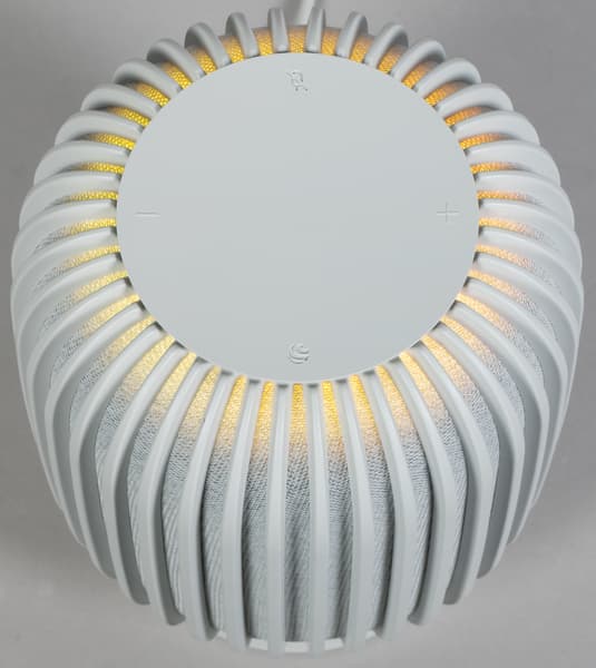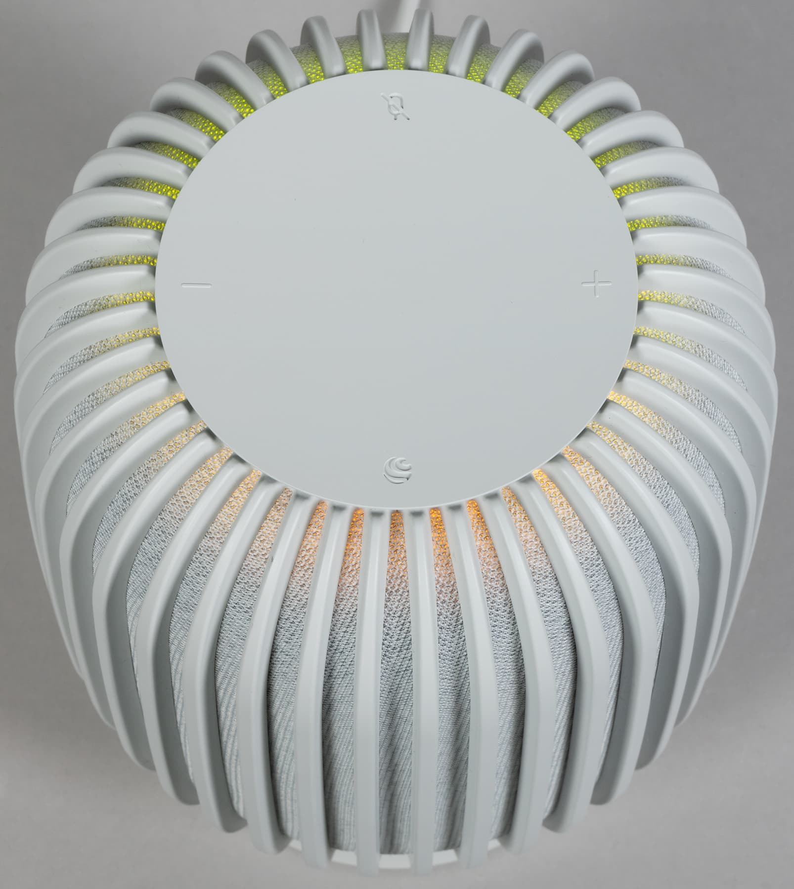 Подсвечивается не только пространство непосредственно под панелью управления, но и чуть ниже. Потому подсветка хорошо заметна пользователю, находящемуся сбоку от устройства. Она изменяется синхронно с речью пользователя, при ответе ассистента и даже в такт музыке — получается и красиво, и информативно. Вот только возможности ее отключения мы пока не обнаружили, а в темное время суток она бы пригодилась.