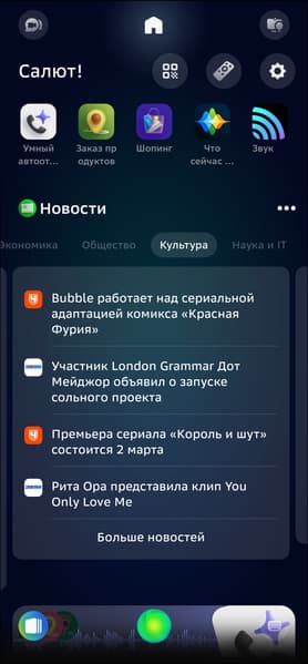 Перед подключением SberBoom необходимо скачать ПО «Салют!», доступное для устройств под управлением Android, владельцам устройств под iOS пока придется пользоваться веб-приложением. Устанавливаем, авторизуемся — попадаем на титульную страницу, где размещены новости и кнопки различных сервисов «Сбера». Нас интересует вкладка с устройствами, доступ к которой осуществляется с помощью иконки в правом верхнем углу. Переходим туда, находим Boom в списке — нажимаем на нее.