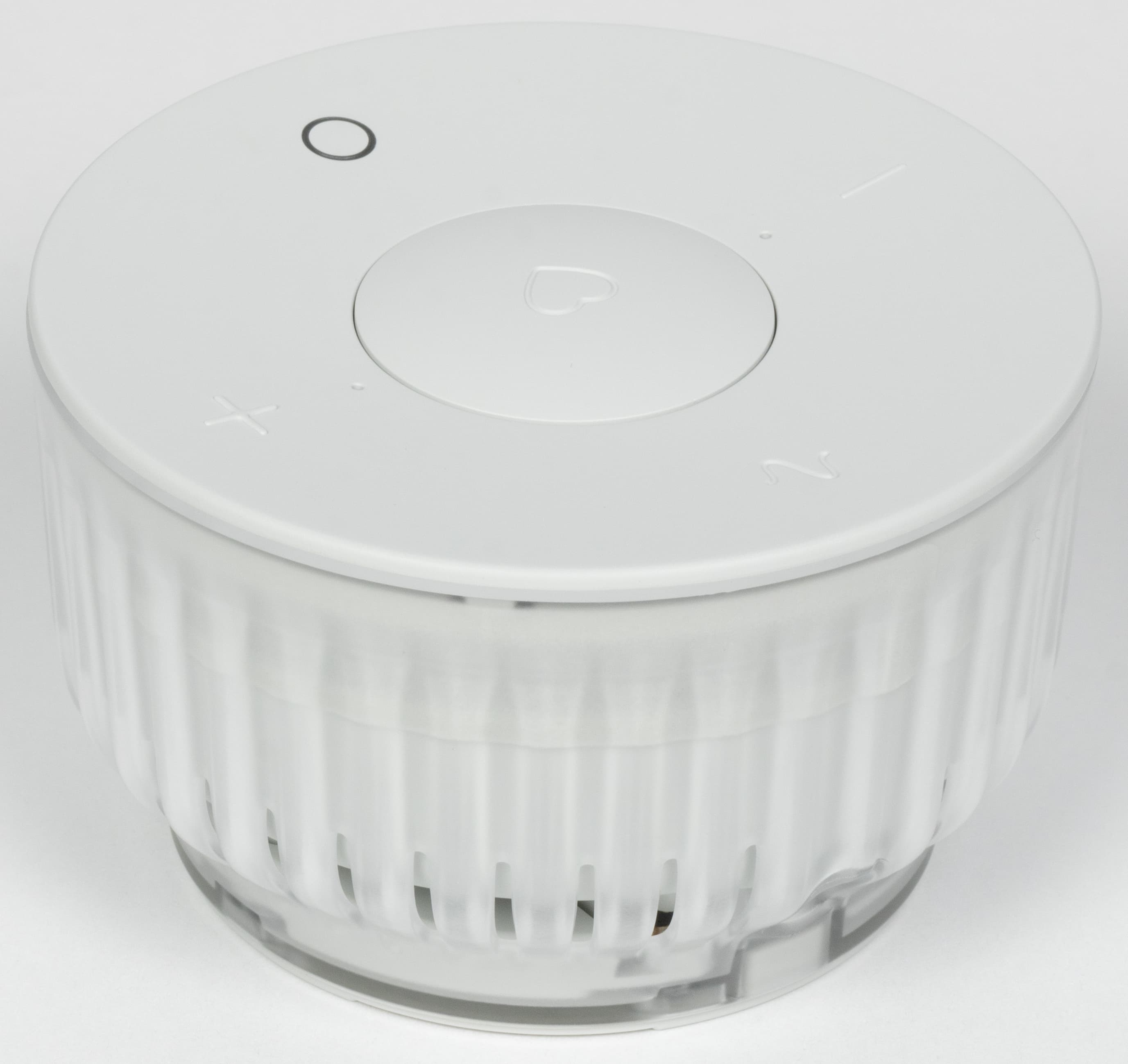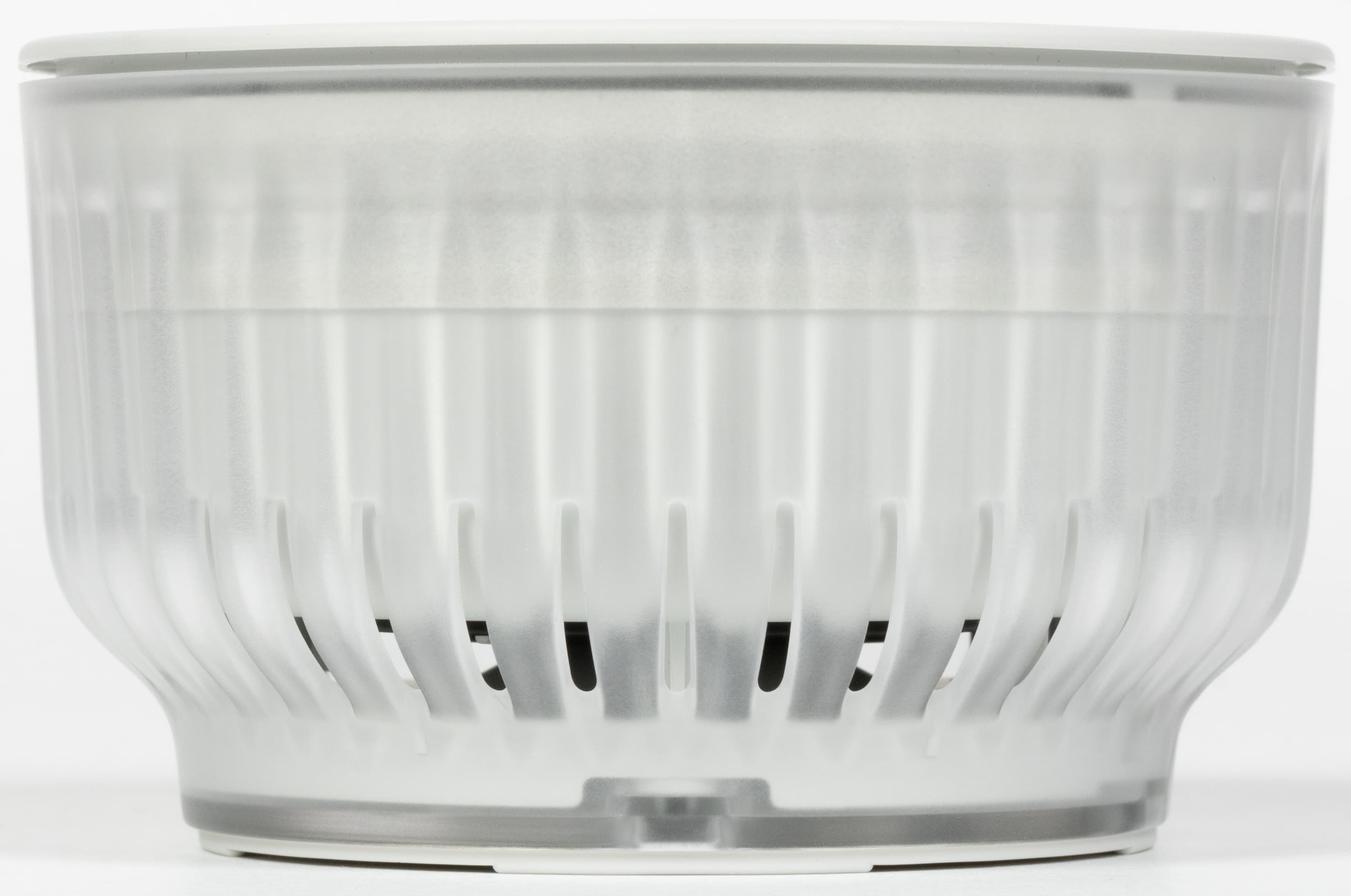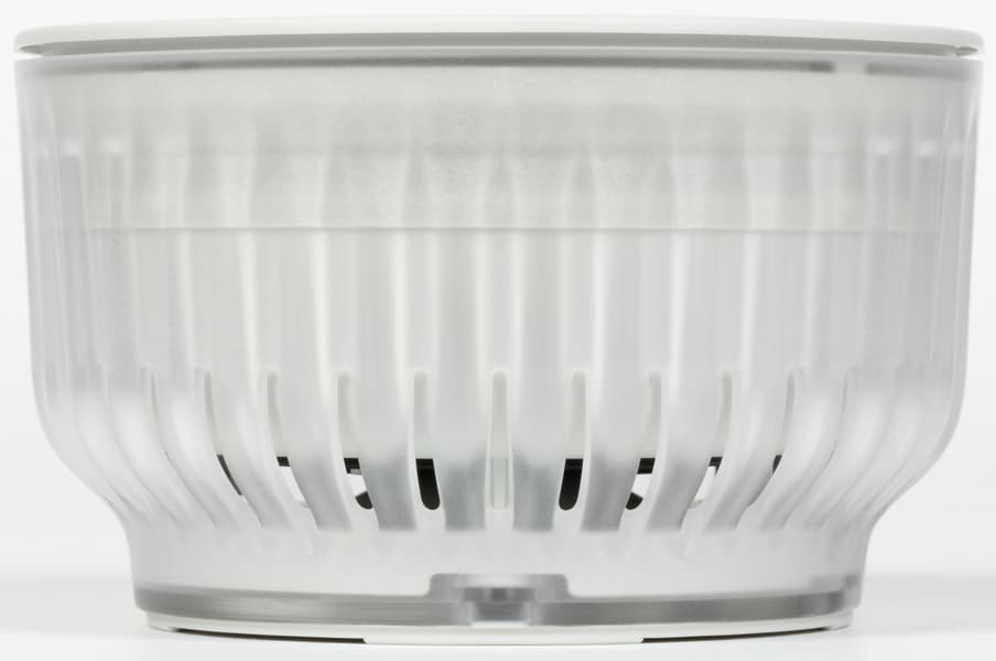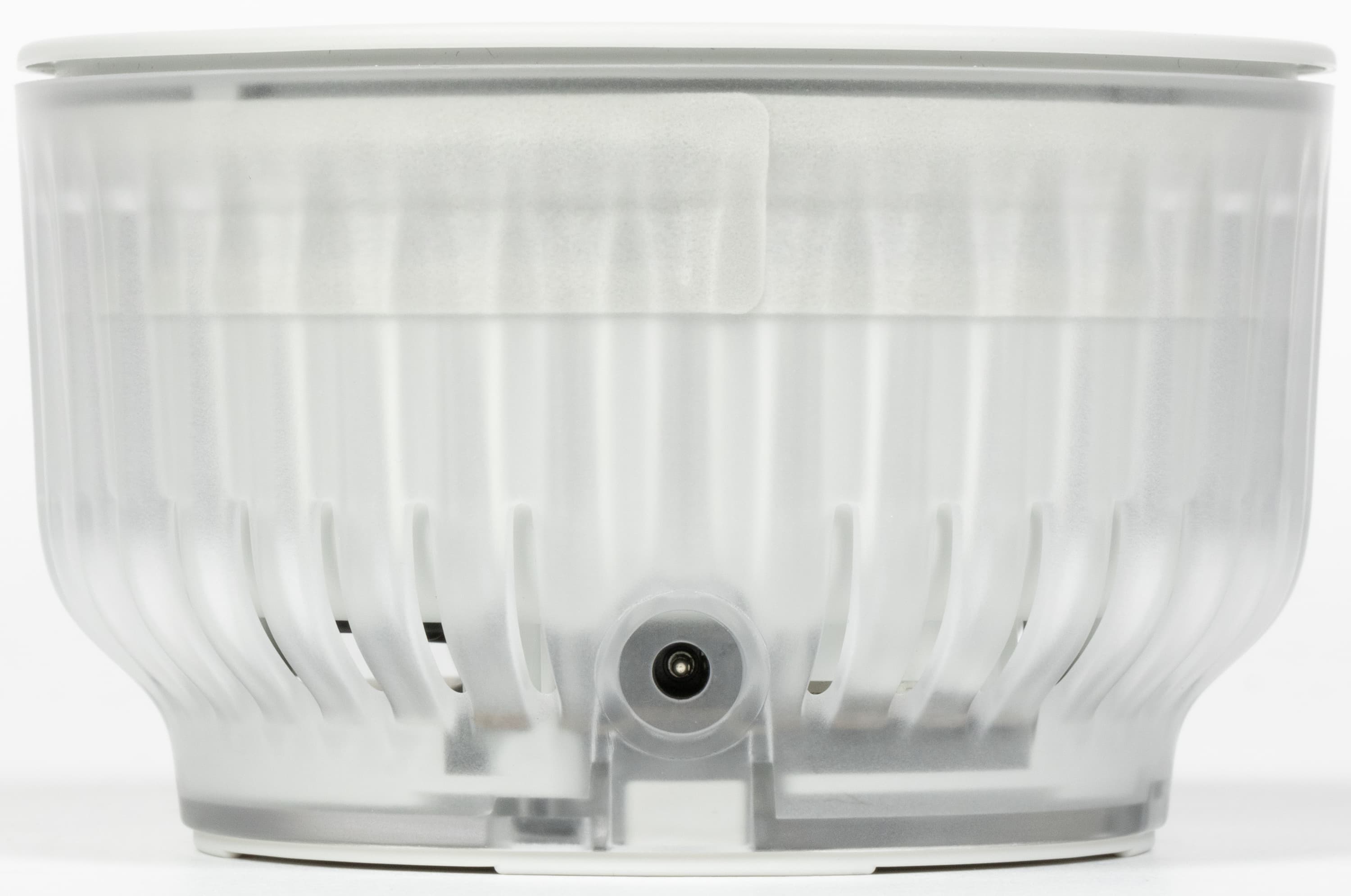 По бокам — ничего особо интересного, просто ребристая прозрачная накладка, за которой в одном месте видно нанесенное на внутреннюю часть корпуса название устройства. Раз есть появился прозрачный элемент — неплохо бы изнутри его чем-нибудь подсветить, но этого пока не сделано. Возможно, подсветку мы увидим в третьей версии колонки — не все сразу. В нижней части размещены отверстия, через которые выходит звук от направленного вниз динамика.