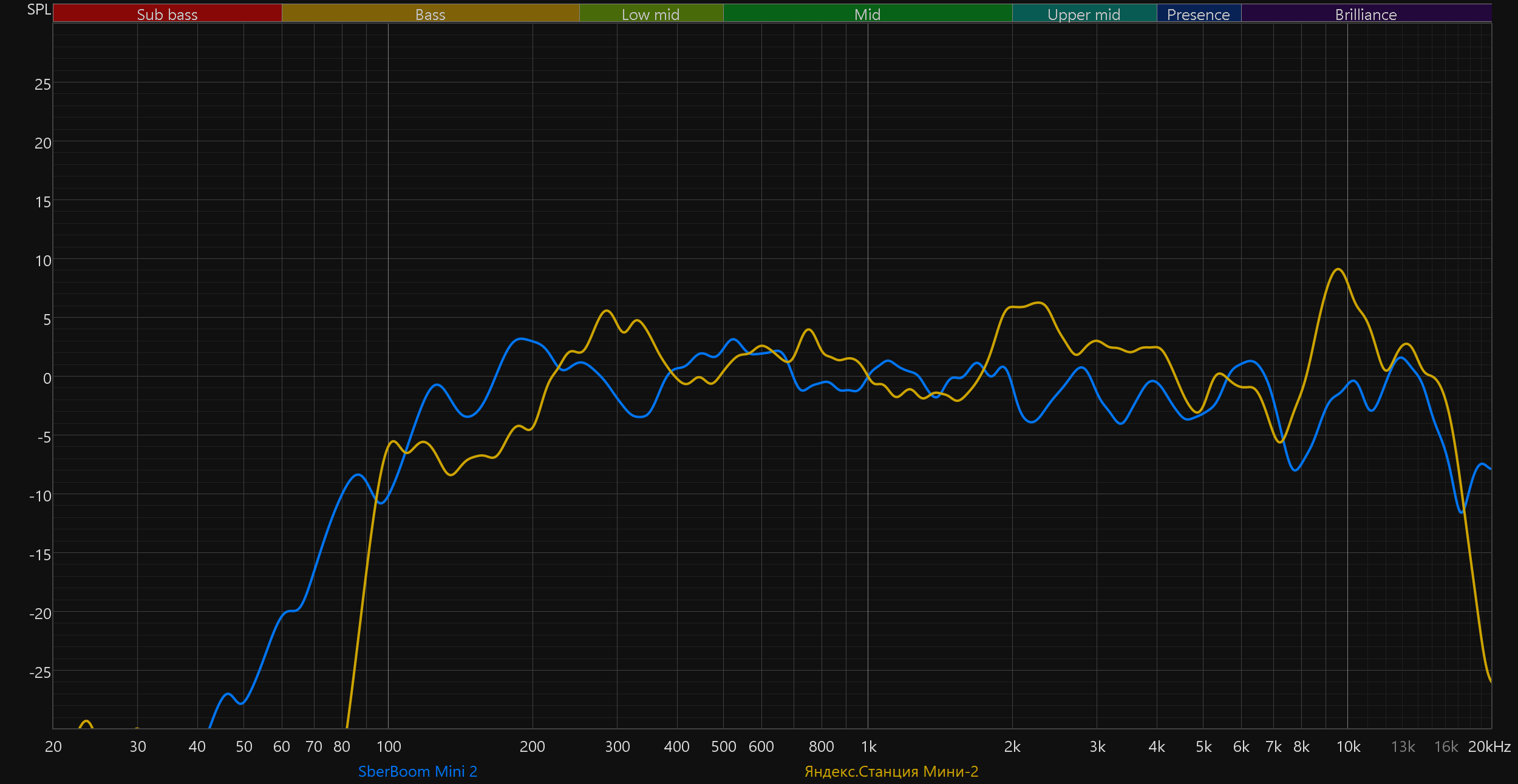 Самое интересное здесь — это, конечно, сравнение новой версии SberBoom Mini со старой. Прогресс налицо — улучшилось воспроизведение НЧ-диапазона, стала более равномерной середина, меньше «изрезан» ВЧ-регистр.