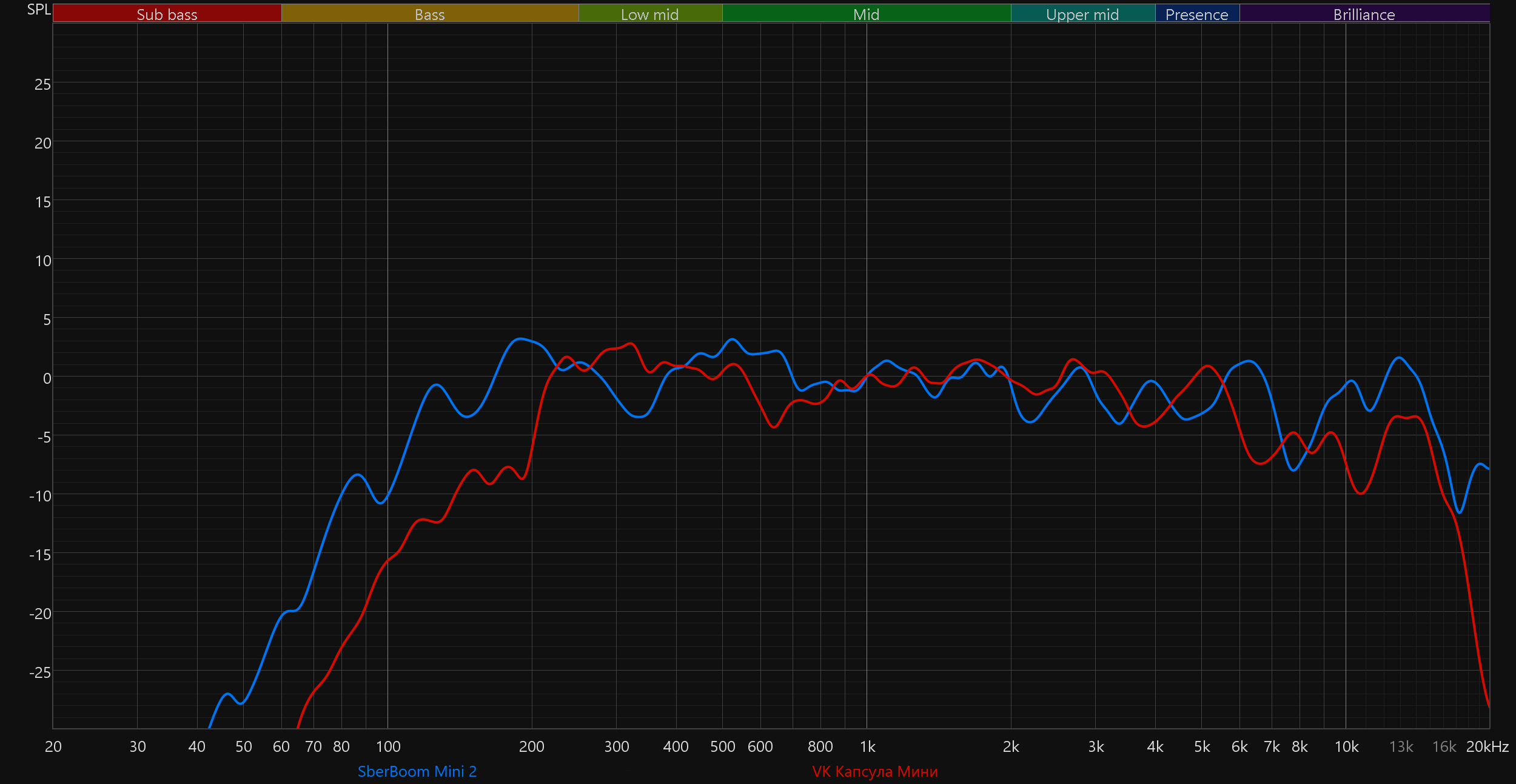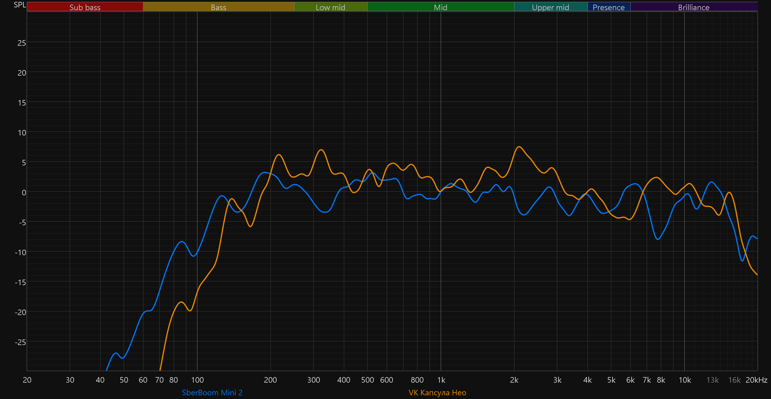 Ну и напоследок сравним новую SberBoom Mini 2 с «Капсулой Нео» и «Капсулой Мини» VK. В первом случае основным фактором является тональный баланс: SberBoom звучит сбалансированнее, соответственно — намного приятнее. Ну а во втором очевиден более широкий частотный диапазон.