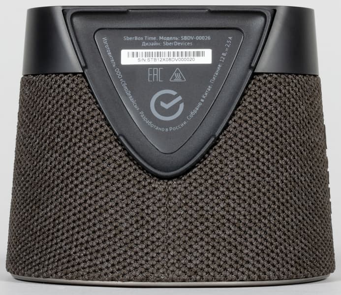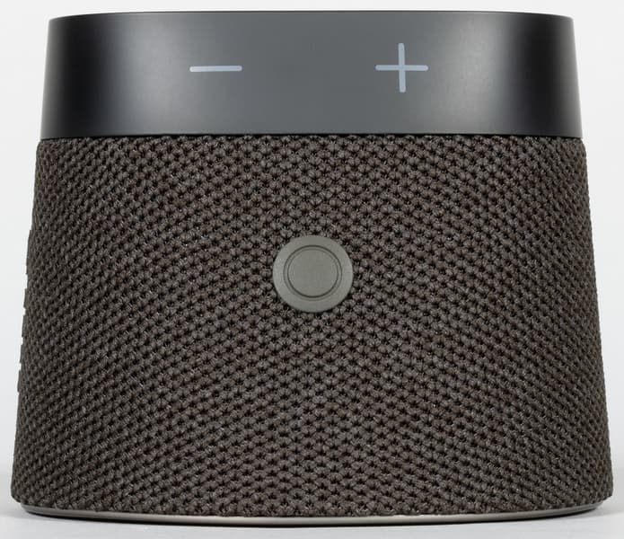 Основная часть корпуса закрыта тканью. Слева можно заметить логотип компании. Основные динамики расположены по бокам, дополнительный пассивный излучатель — сверху.