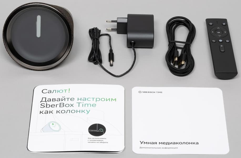 В комплекте с колонкой идут блок питания, пульт ДУ, кабель HDMI и краткая инструкция по началу работу. Блок питания черного цвета (для всех вариантов расцветки самой колонки), тонкий гибкий кабель длиной 1,5 метра заканчивается стандартным круглым штекером.