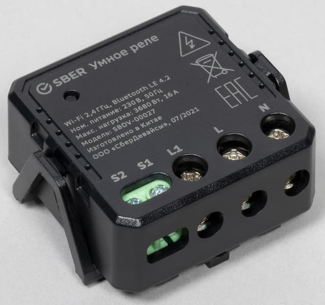 После монтажа в нужное место (напомним, что реле работает с напряжением сети, так что установка требует опыта и соблюдения правил безопасности) необходимо подключить его к вашему аккаунту. Для этого в мобильном приложении Салют необходимо выбрать пункт «Добавить устройство» и перевести реле в режим подключения. Очень удобно, что для данной операции можно использовать не только скрытую кнопку, но и подключенный к клеммам S1/S2 выключатель или даже основное питание реле. Это позволяет изменить конфигурацию даже после монтажа реле. Хотя, на наш взгляд, лучше все-таки сначала провести данную операцию с тестовым подключением, а потом уже установить реле на планируемое место размещения.