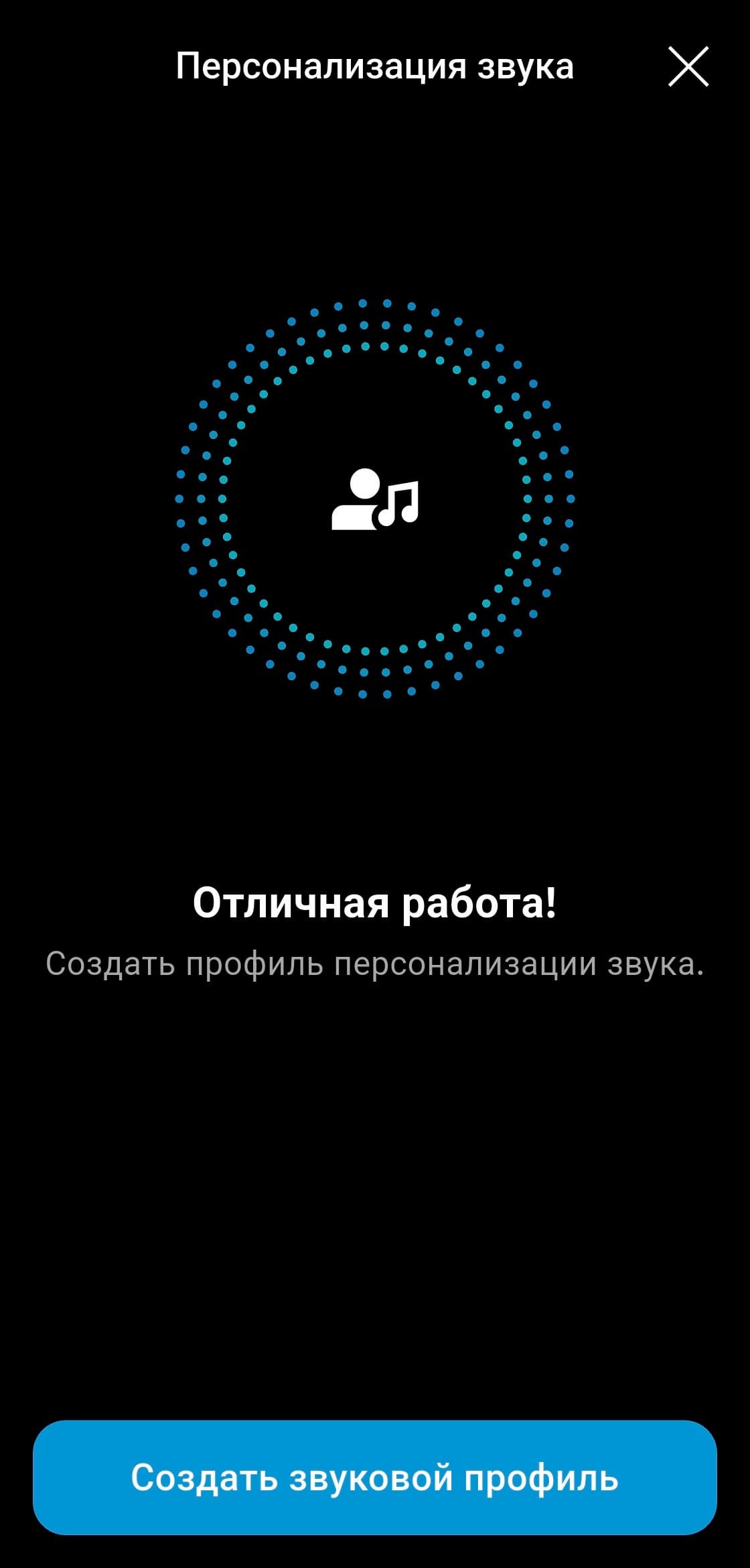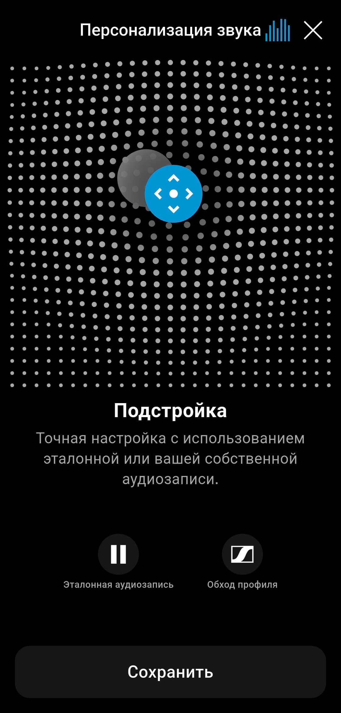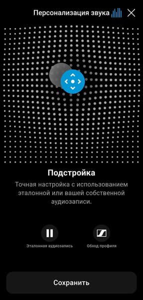 На заключительном этапе доступна тонкая подстройка через матрицу тонального баланса: перемещая регулятор, можно добавить нужный акцент — сделать профиль более «темным», усилив низкие частоты, или, наоборот, более «светлым». В качестве ориентира можно использовать как встроенный «эталонный трек», так и собственную коллекцию музыки.