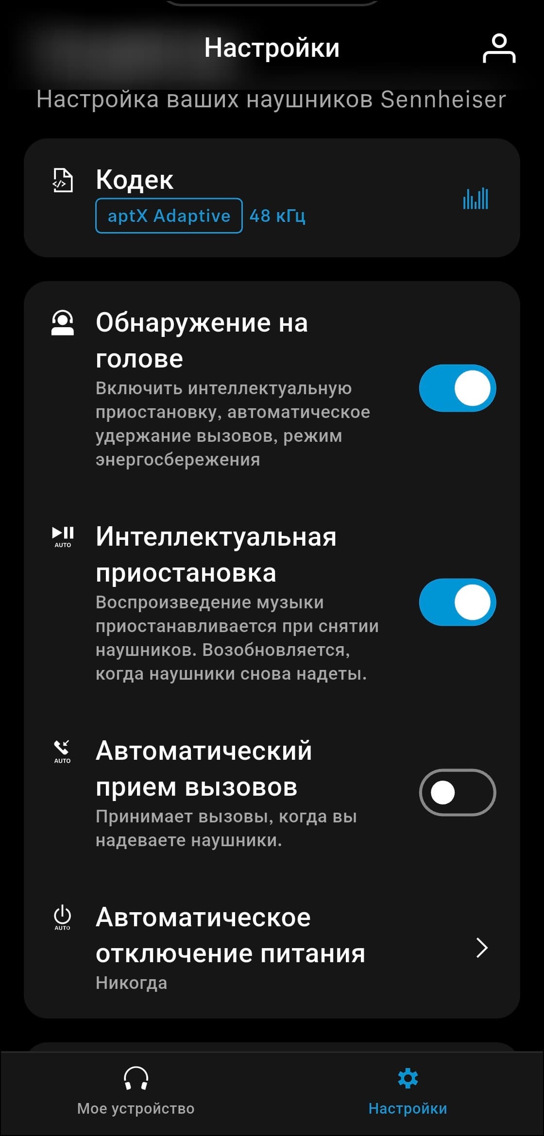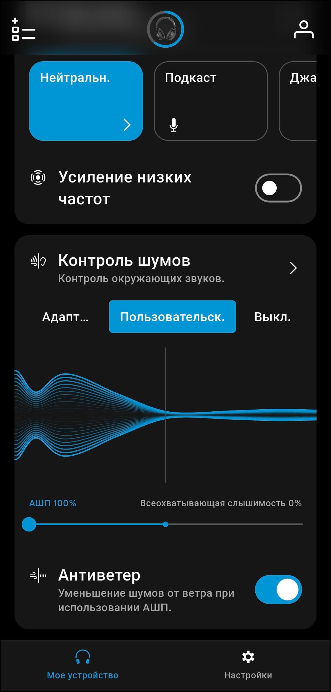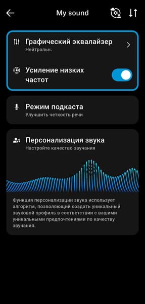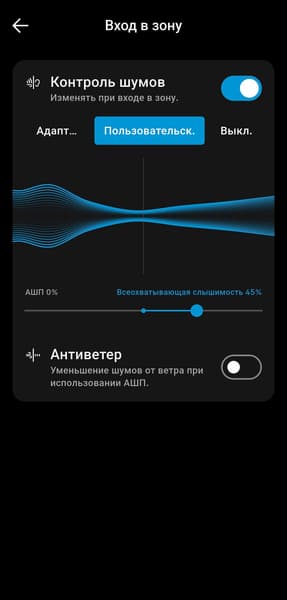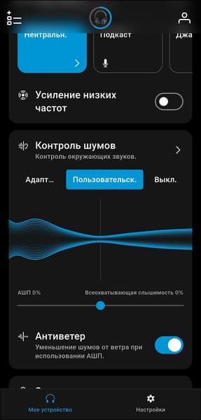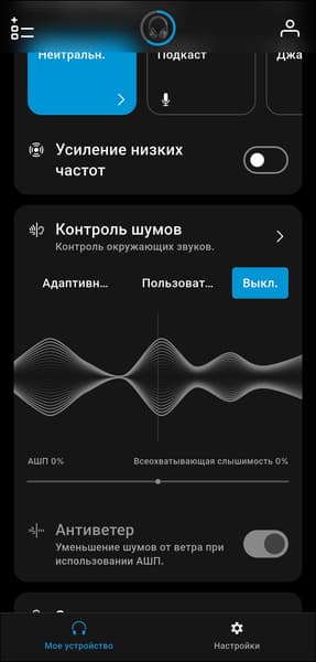 Система шумоподавления реализована довольно специфично. Доступны адаптивный режим, при котором гарнитура автоматически подстраивается под обстановку, и плавное ручное переключение между активным шумоподавлением и режимом прозрачности с помощью ползунка в приложении. До ноябрьского обновления 2025 года это были единственные два варианта — возможность полностью отключить шумоподавление отсутствовала, что вызывало заметное недовольство пользователей.