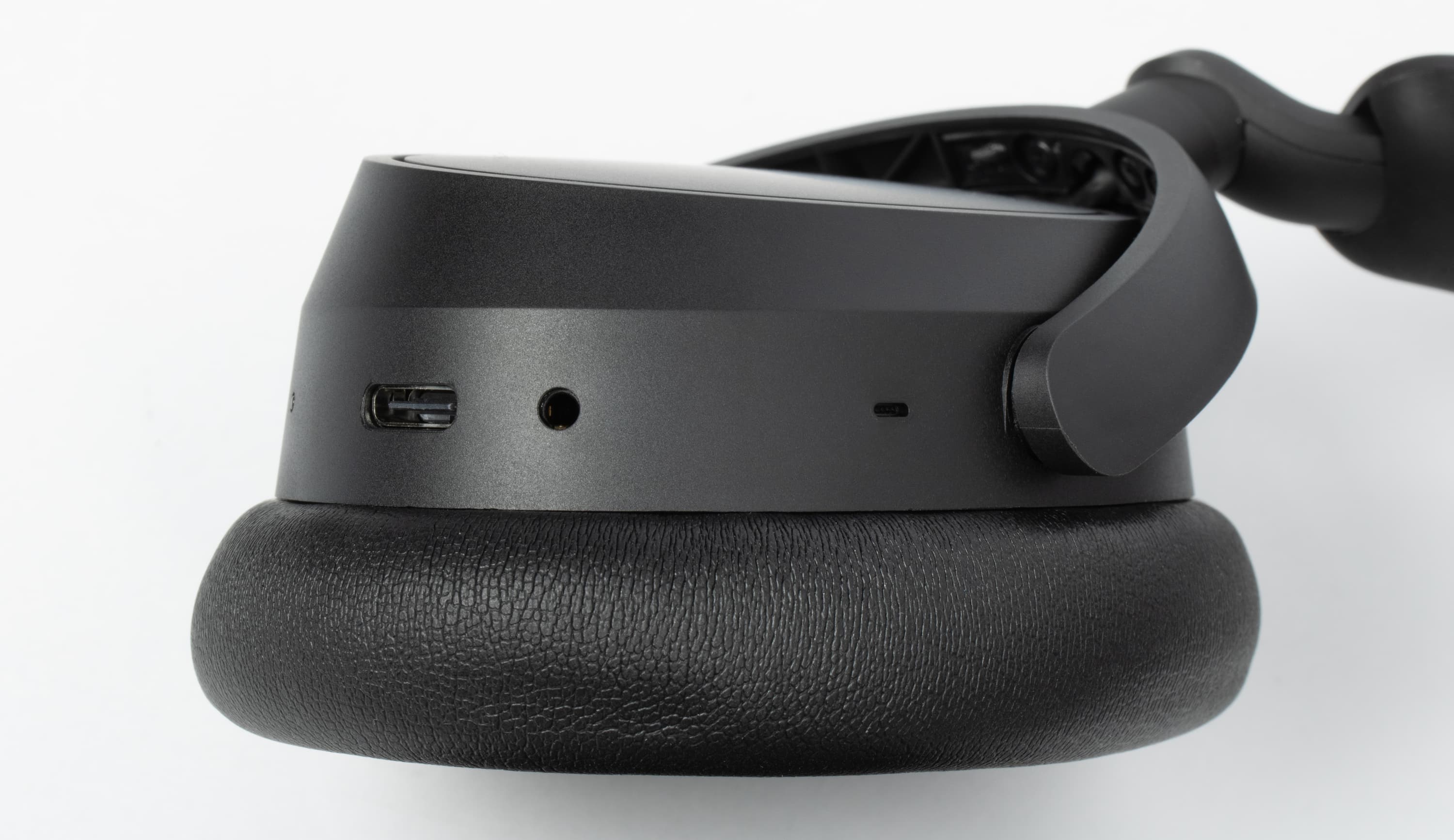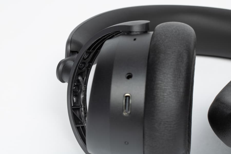 Внутри креплений чашек видны провода, идущие к динамикам — потенциально один из самых уязвимых элементов конструкции. Судя по деформации изоляции, можно предположить, что уложены они очень плотно — вероятнее всего, вручную. Остается надеяться, что это не скажется на надежности, и конструкция прослужит долго. В нижней части правой чашки находятся разъемы для подключения, а ближе к переднему краю — небольшое отверстие микрофона для голосовой связи.