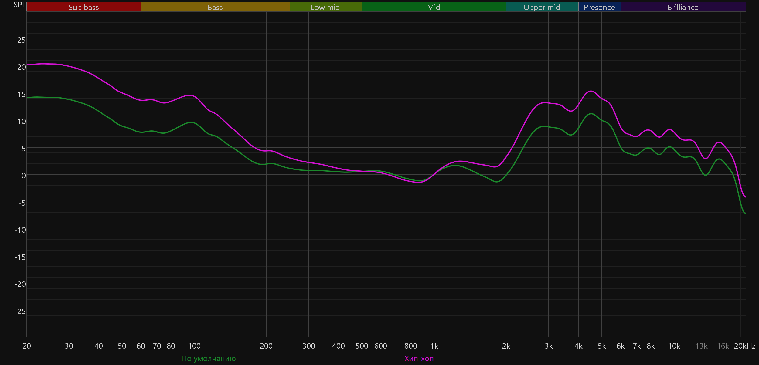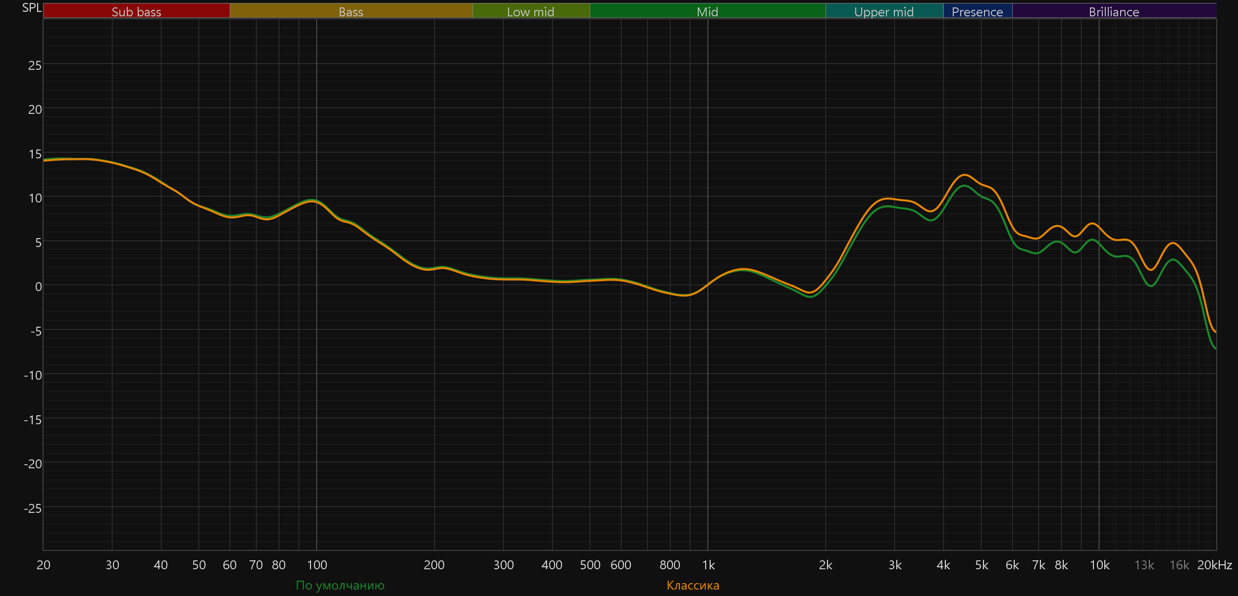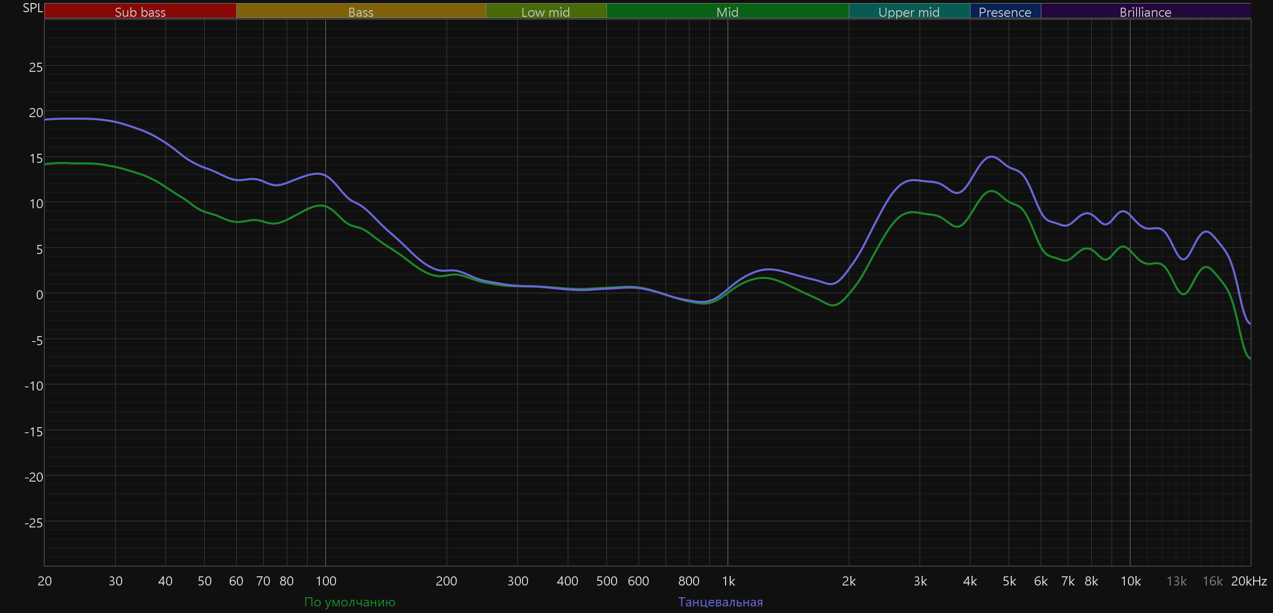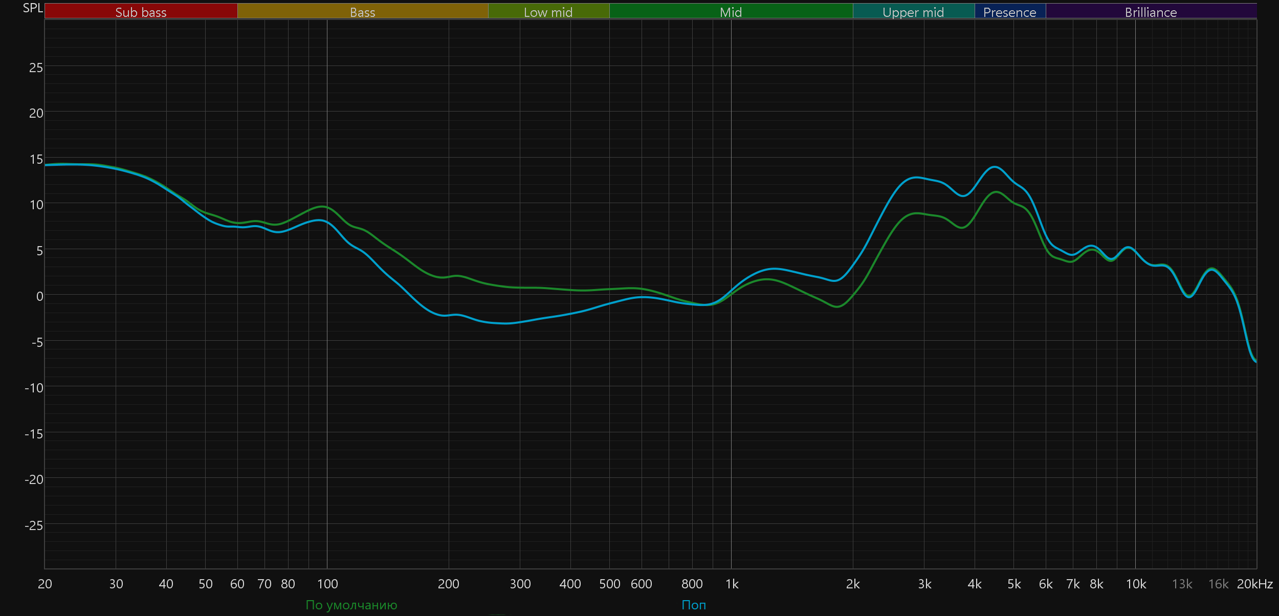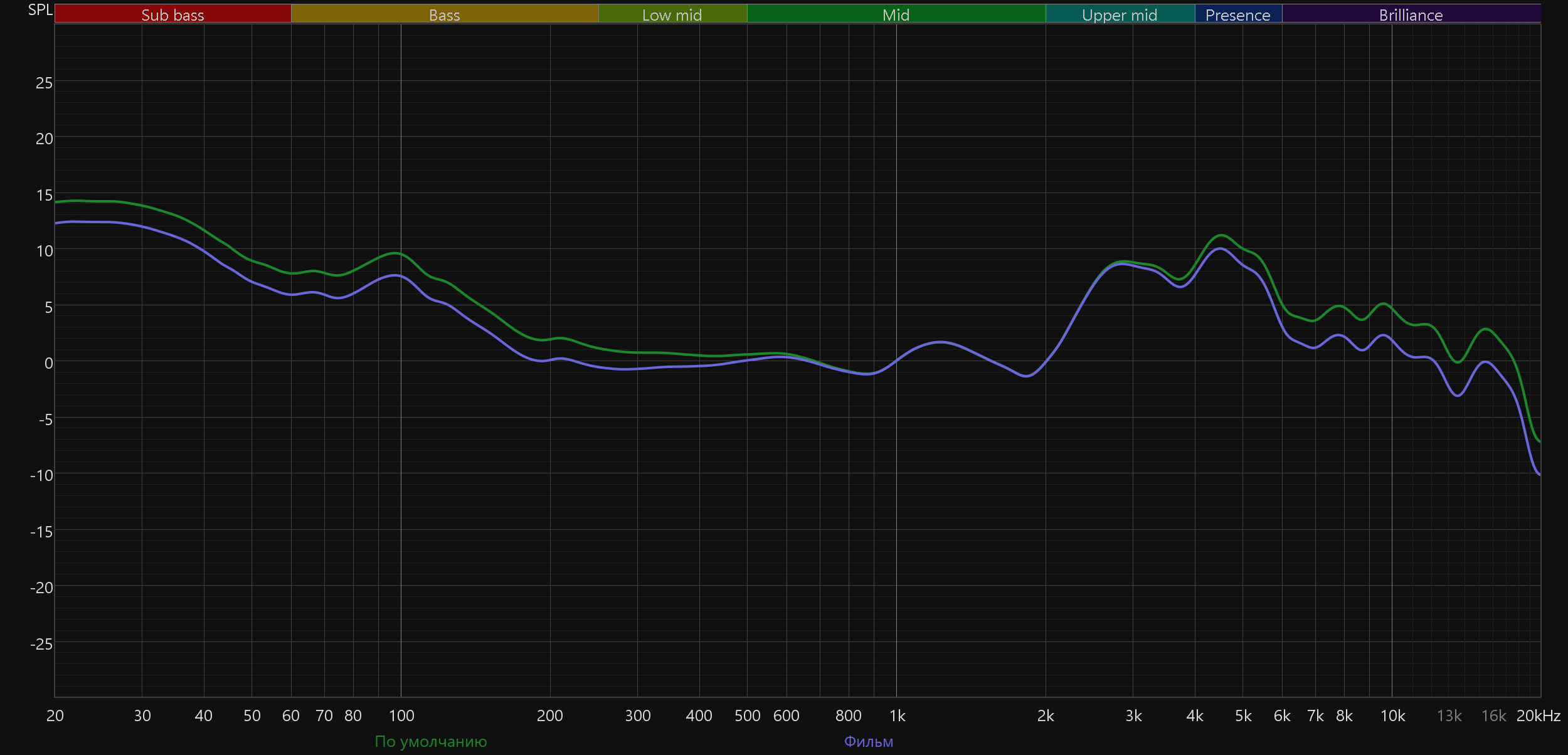 График АЧХ при этом меняется не слишком радикально: акцент в низкочастотном диапазоне сохраняется, но выражен уже не так сильно, а нижняя середина звучит чуть ровнее и комфортнее.