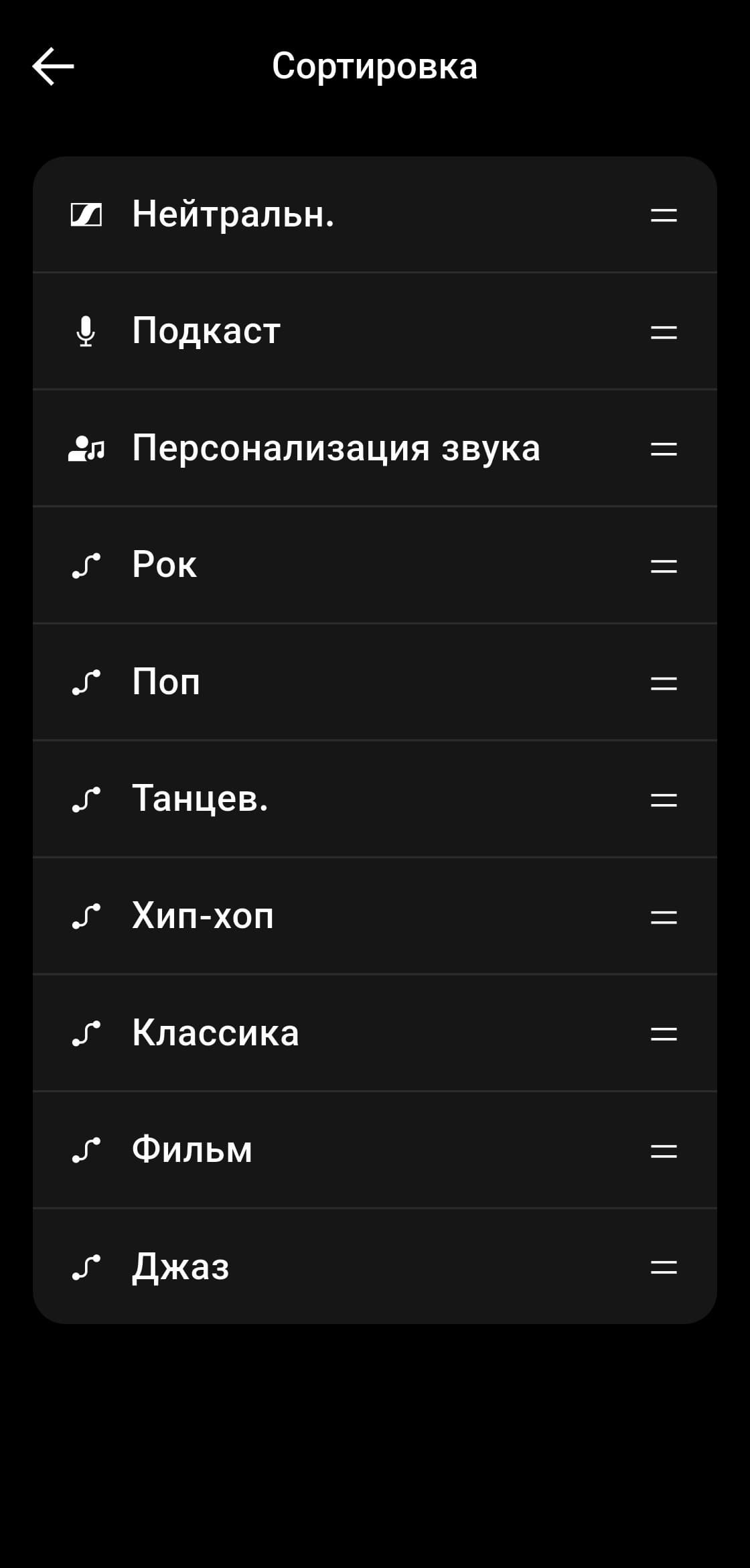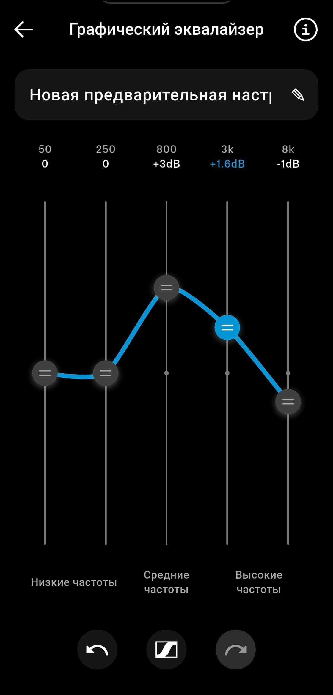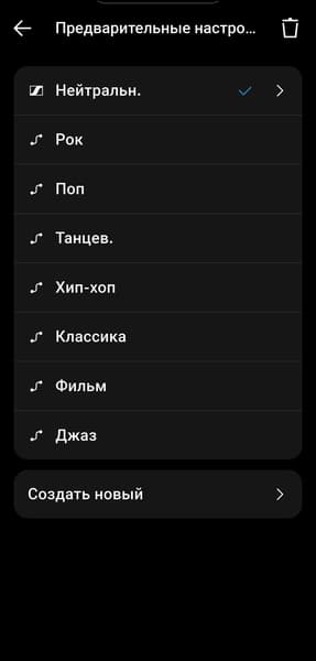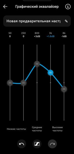 Эквалайзер в приложении предлагает обширный набор пресетов, каждый можно открыть и посмотреть, как именно он устроен. Есть возможность создать и собственный профиль. Как мы покажем ниже, наушники хорошо поддаются эквализации, но эквалайзер в приложении ограничен всего пятью полосами. Для полноценной тонкой настройки этого явно мало, однако для управления ключевыми акцентами — вполне достаточно. А большего в большинстве случаев и не требуется.