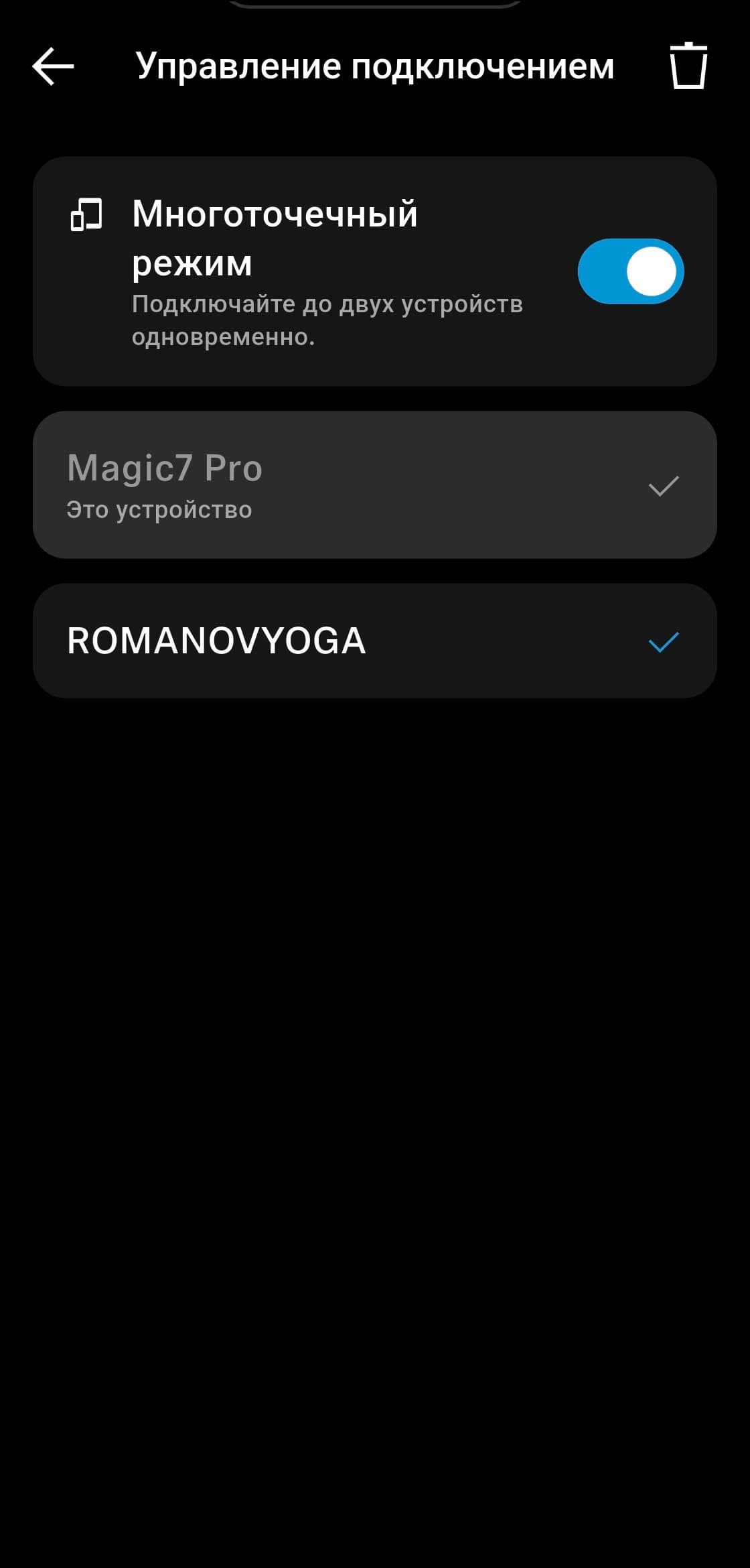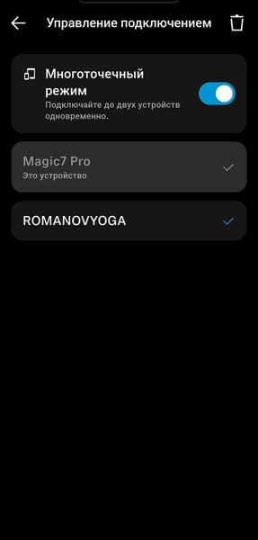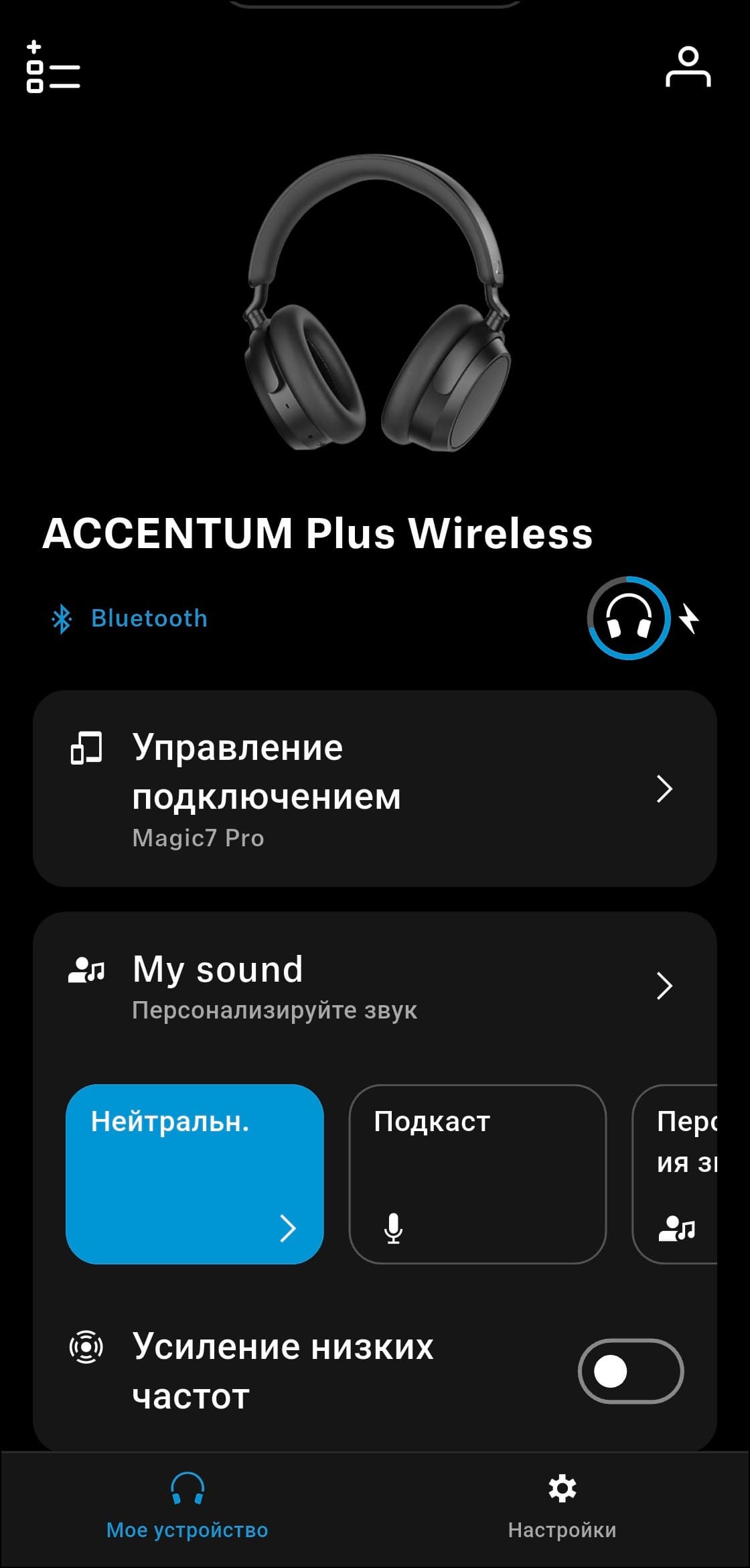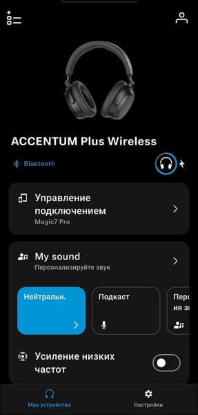 После завершения первоначальной настройки приложение переходит на главный экран. В верхней его части отображается изображение наушников, ниже — активный тип подключения и уровень заряда. Следующий блок отвечает за управление мультипойнтом: одновременно наушники могут быть подключены к двум устройствам. Полный список сопряженных устройств доступен на отдельной странице, там можно включать или отключать автоподключение, а также выбирать, какие из них будут активными в данный момент.