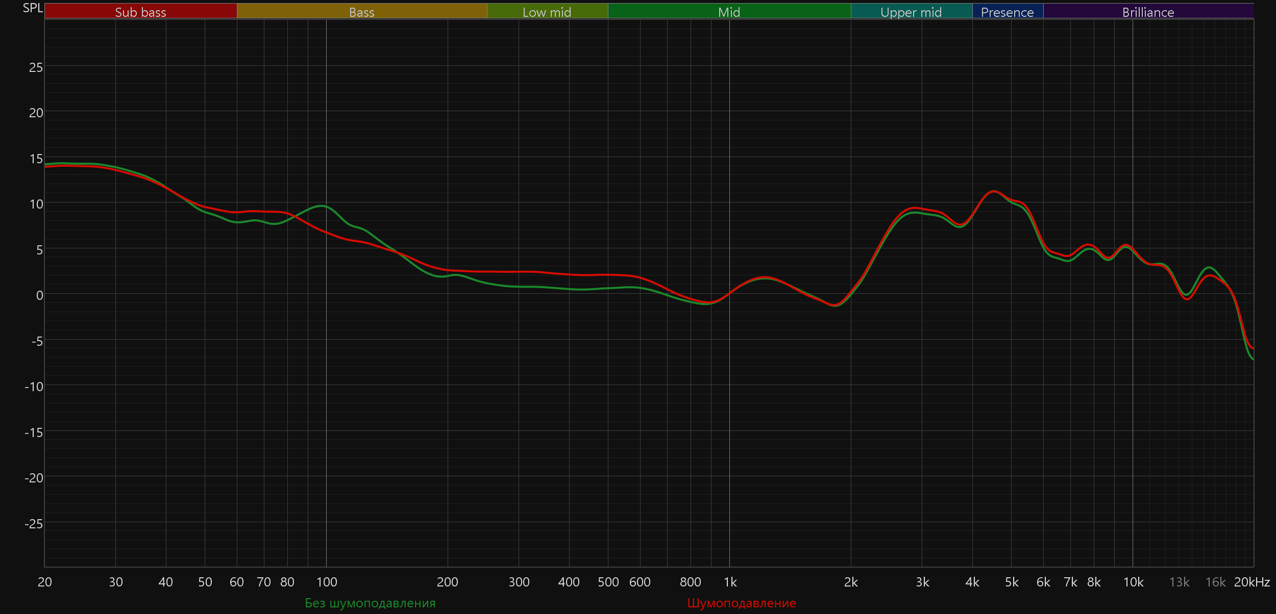 Включение активного шумоподавления практически не оказывает негативного влияния на характер звучания. Более того, звук становится даже немного более сбалансированным: уходит акцент на мидбасе, а нижняя середина, наоборот, слегка подчеркивается. Это вполне ожидаемо, учитывая, что до недавнего времени шумоподавление нельзя было отключить — логично, что звук изначально настраивался с его учетом.