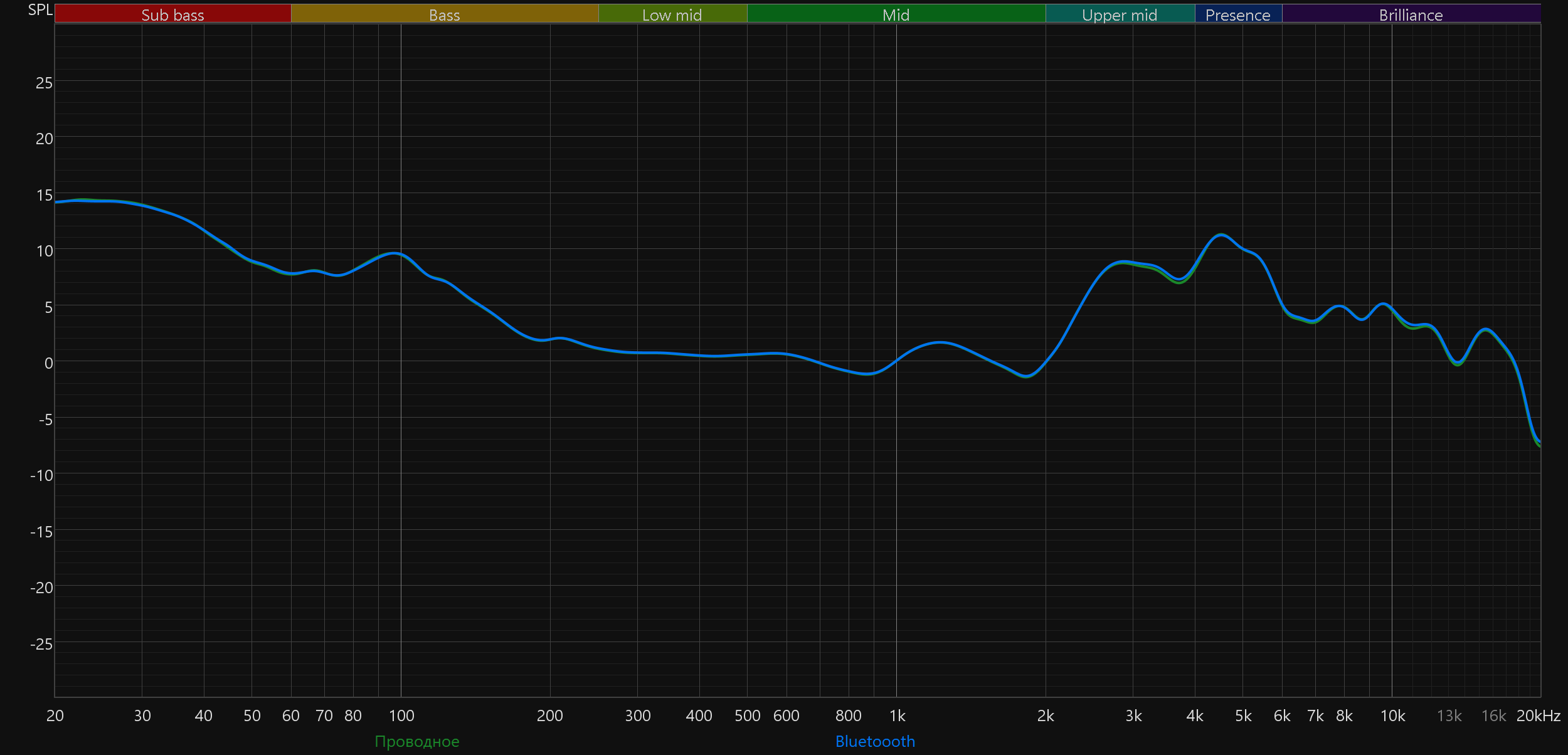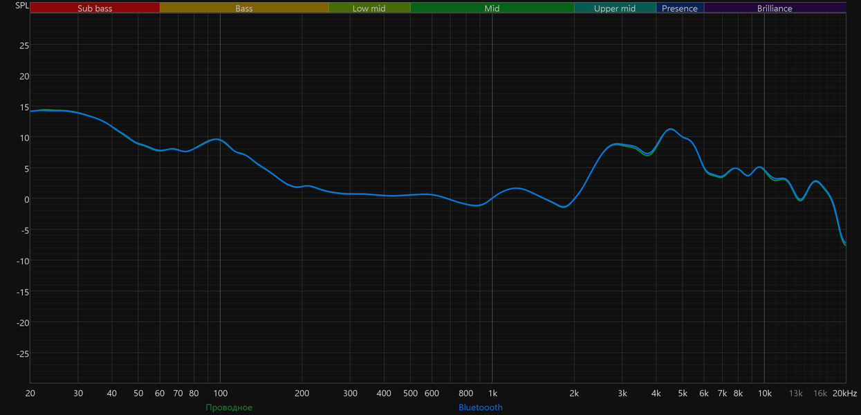 В таком виде график довольно полно иллюстрирует субъективные впечатления от прослушивания наушников. К изрезанности графика в ВЧ-регистре как всегда не стоит относиться слишком серьезно. Сравнение графиков при переходе с пассивного аналогового подключения на беспроводное показывает, что профиль не меняется — по умолчанию цифровая обработка (DSP) не вмешивается в звучание.