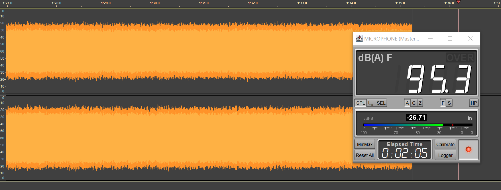 Безопасным уровнем звукового давления при прослушивании музыки считается 75 дБ, но на практике большинство слушателей предпочитает уровень 90-100 дБ. Мы транслируем в наушники белый шум, фиксируя уровень SPL в районе 95 дБ, сразу после старта воспроизведения запускаем запись сигнала с измерительного стенда — по длине получившегося трека легко понять, сколько устройство проработало.