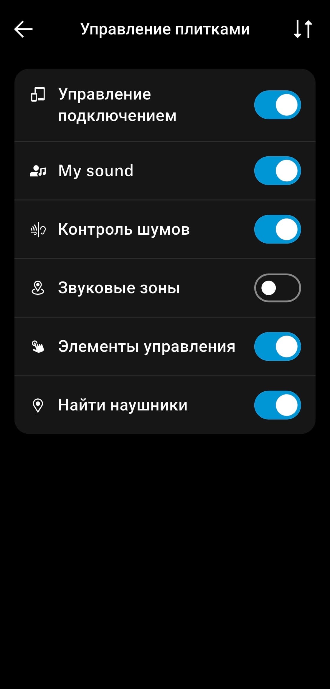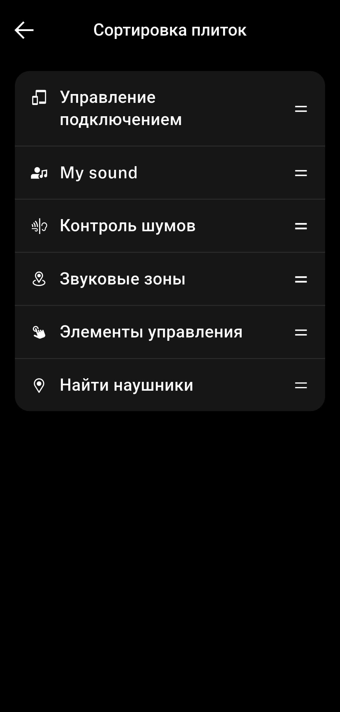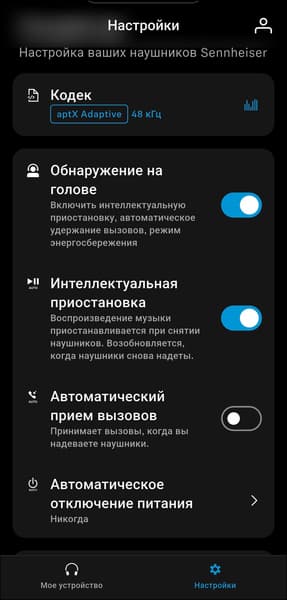 Также при условии доступа к геопозиции приложение может отслеживать положение наушников, что помогает найти их в случае потери. Модули на главной странице, которые в интерфейсе называются «плитками», можно отключать и сортировать — очень удобная опция, которой сильно не хватает в приложениях других производителей. В разделе настроек отображается используемый кодек, есть возможность полностью отключить датчик ношения, плюс отдельно управлять функциями автоматической паузы и автоответа на звонки.