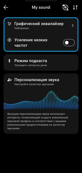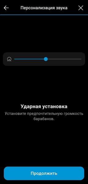 Персонализация под особенности слуха и вкусы владельца наушников в приложении предусмотрена, но реализована довольно оригинальным образом. Сначала предлагается прослушать короткие музыкальные фрагменты с разными инструментами и настроить предпочтительный баланс громкости между ними. После нескольких повторов формируется индивидуальный профиль звучания. Метод в целом работает неплохо и подходит даже тем, у кого нет опыта в настройке звука. Но все же полноценный эквалайзер, хорошо знакомый музыкальный материал и немного усидчивости способны дать куда более впечатляющий результат.
