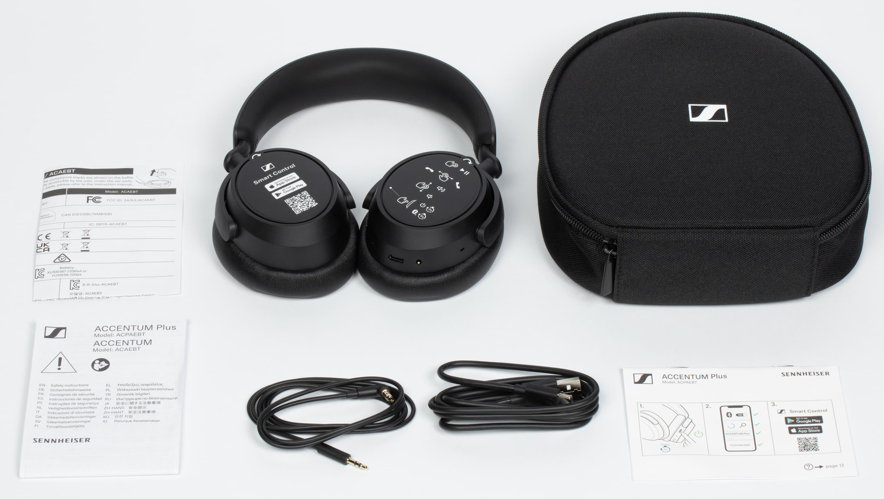 В комплект поставки входят сами наушники, чехол, кабель USB-A — USB-C, аудиокабель для аналогового подключения к источнику звука, а также документация. На внешней панели левой чашки размещена наклейка со ссылкой на загрузку фирменного ПО, на правой — краткая инструкция по управлению с помощью свайпов по сенсорной панели.