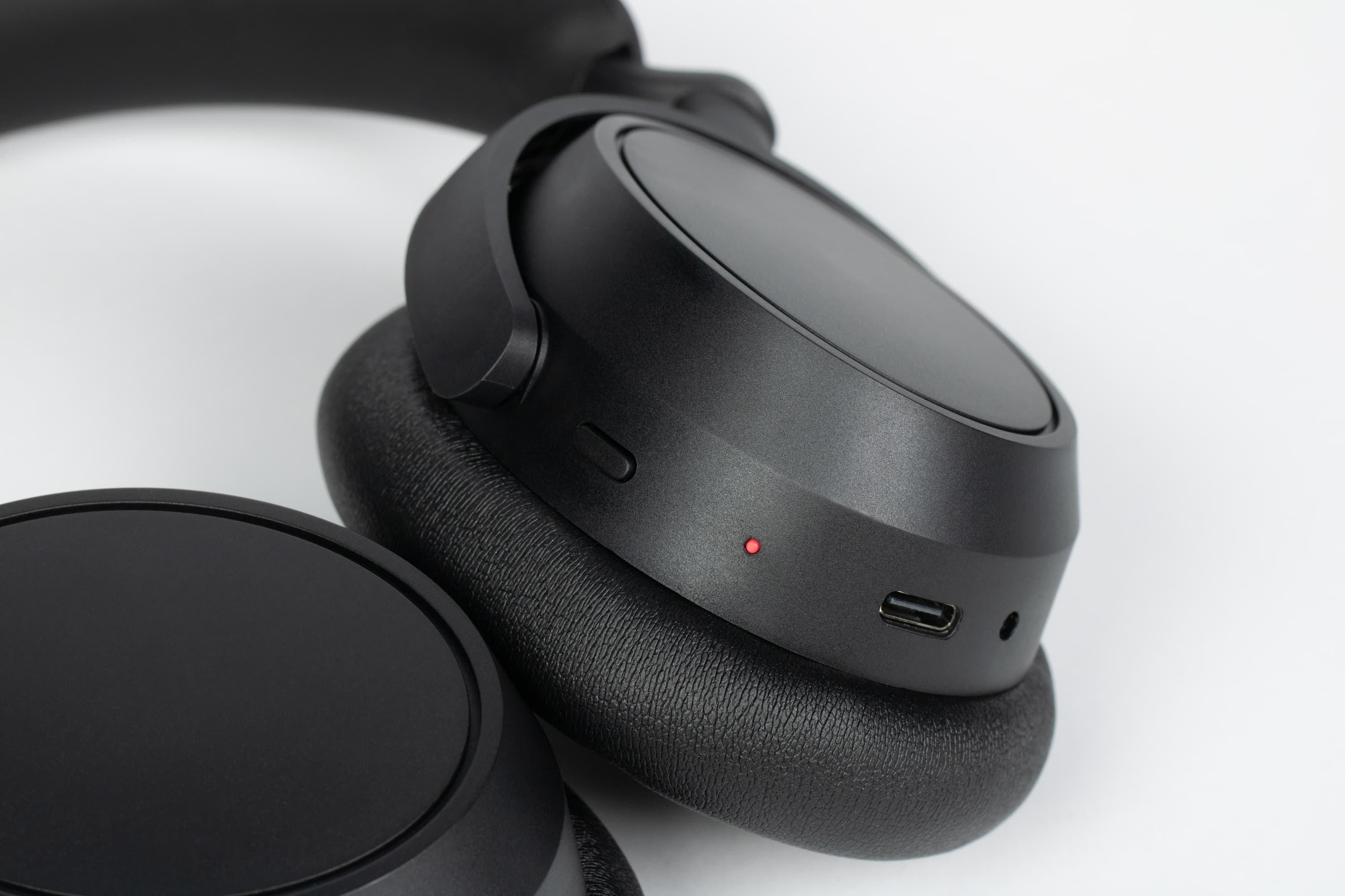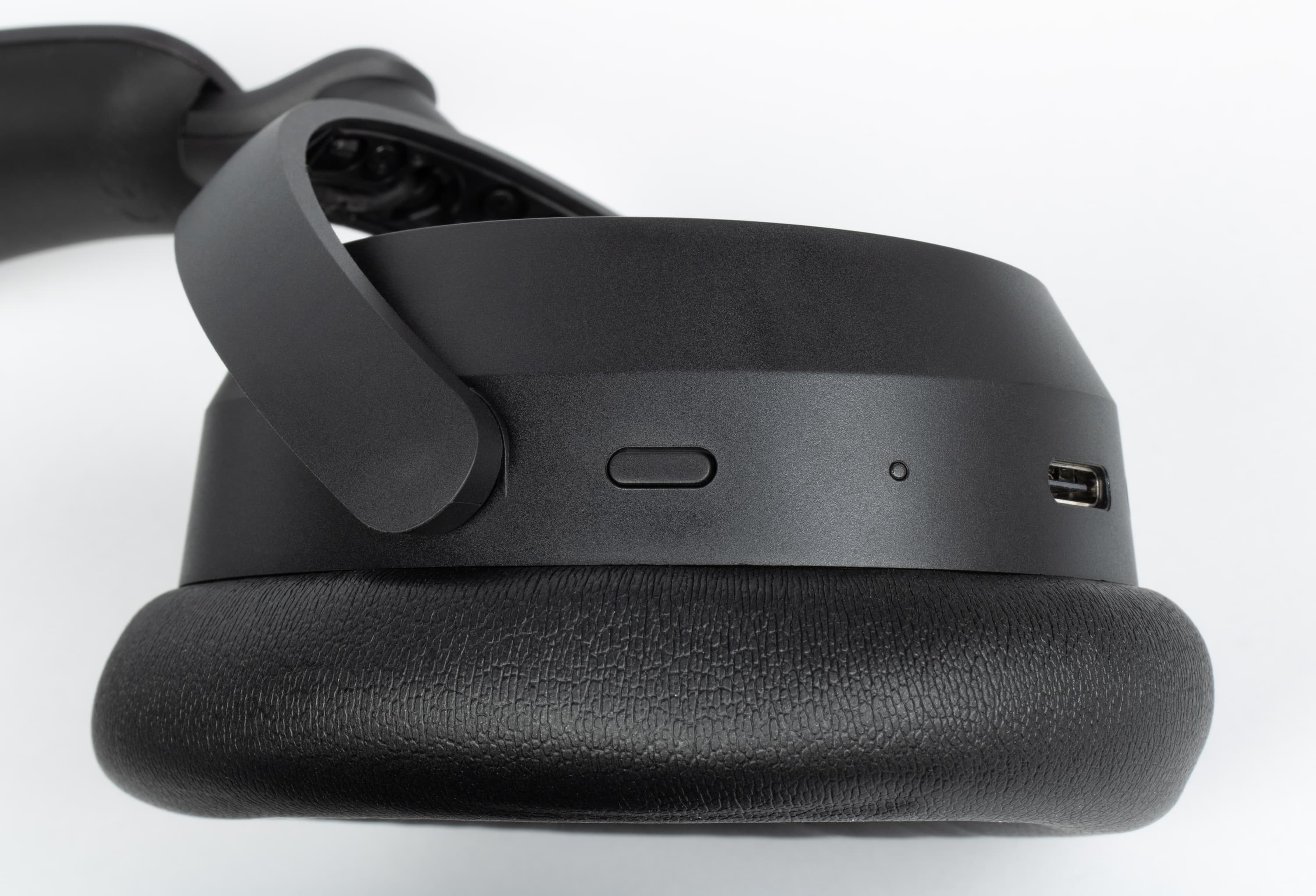 В задней части правой чашки расположены единственная механическая кнопка и небольшой светодиодный индикатор состояния и зарядки.
