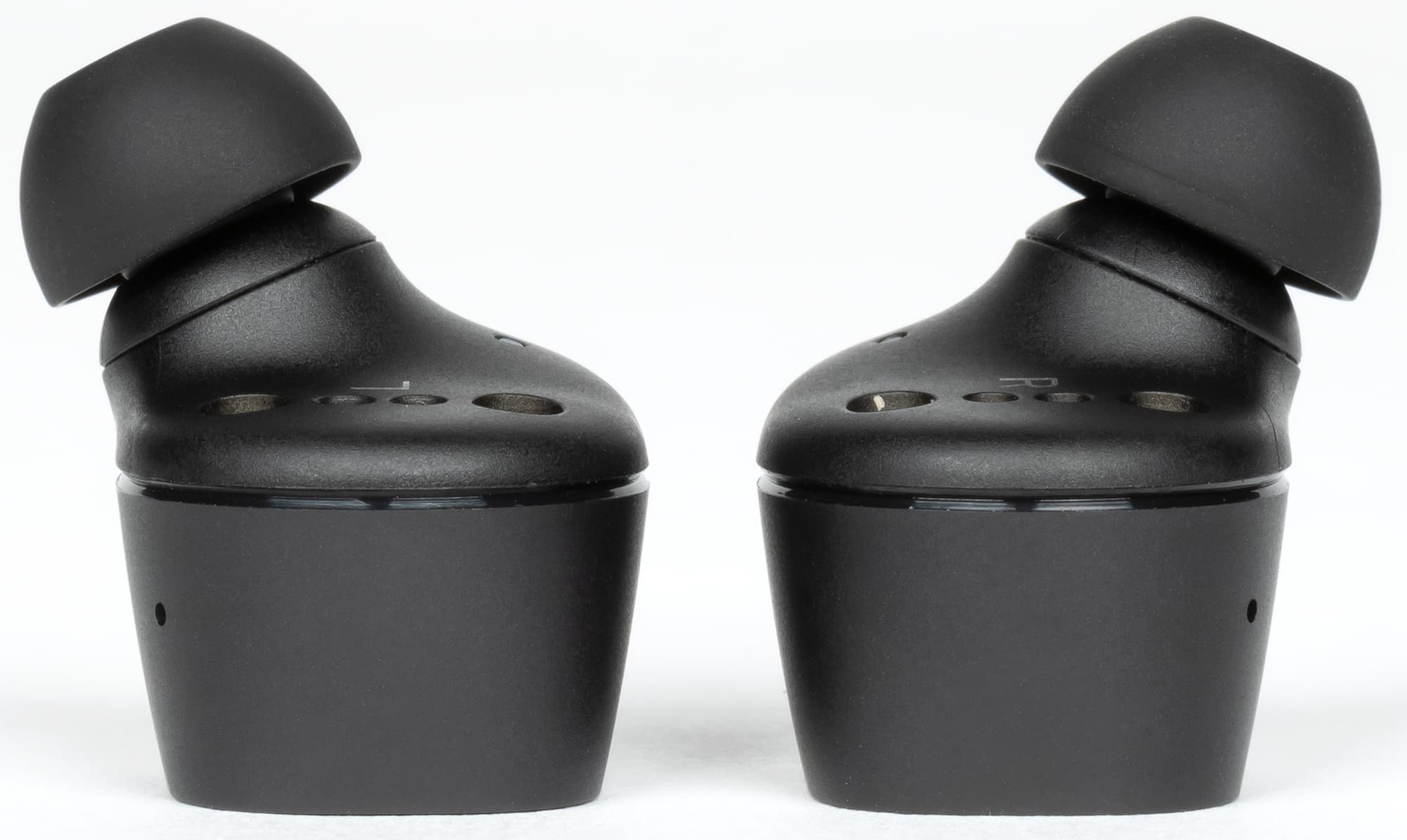 Лучше сориентироваться в расположении отверстий можно посмотрев на наушники сбоку. Также с этого ракурса хорошо видно, что звуковод не очень длинный и выходит из корпуса под углом.