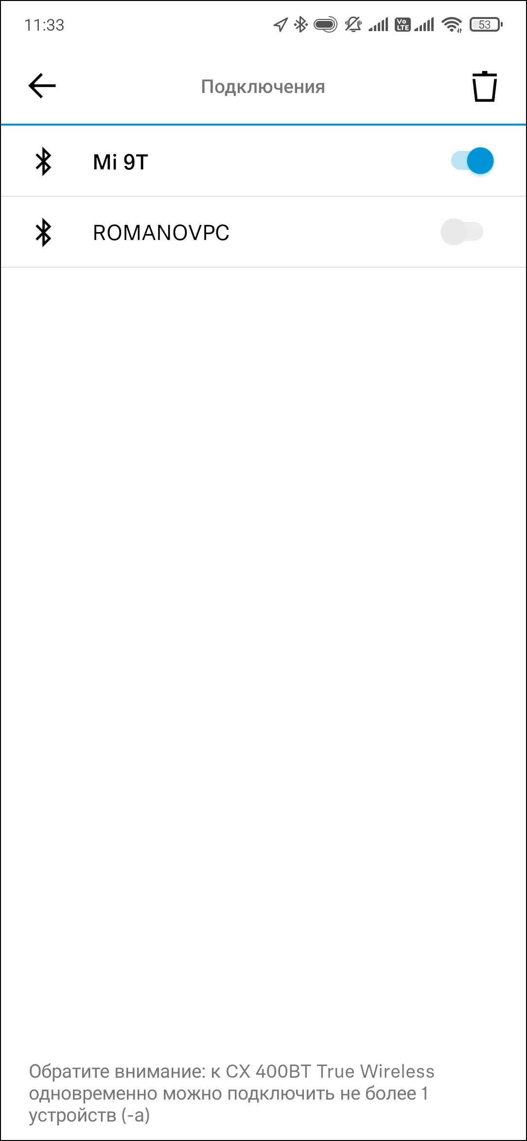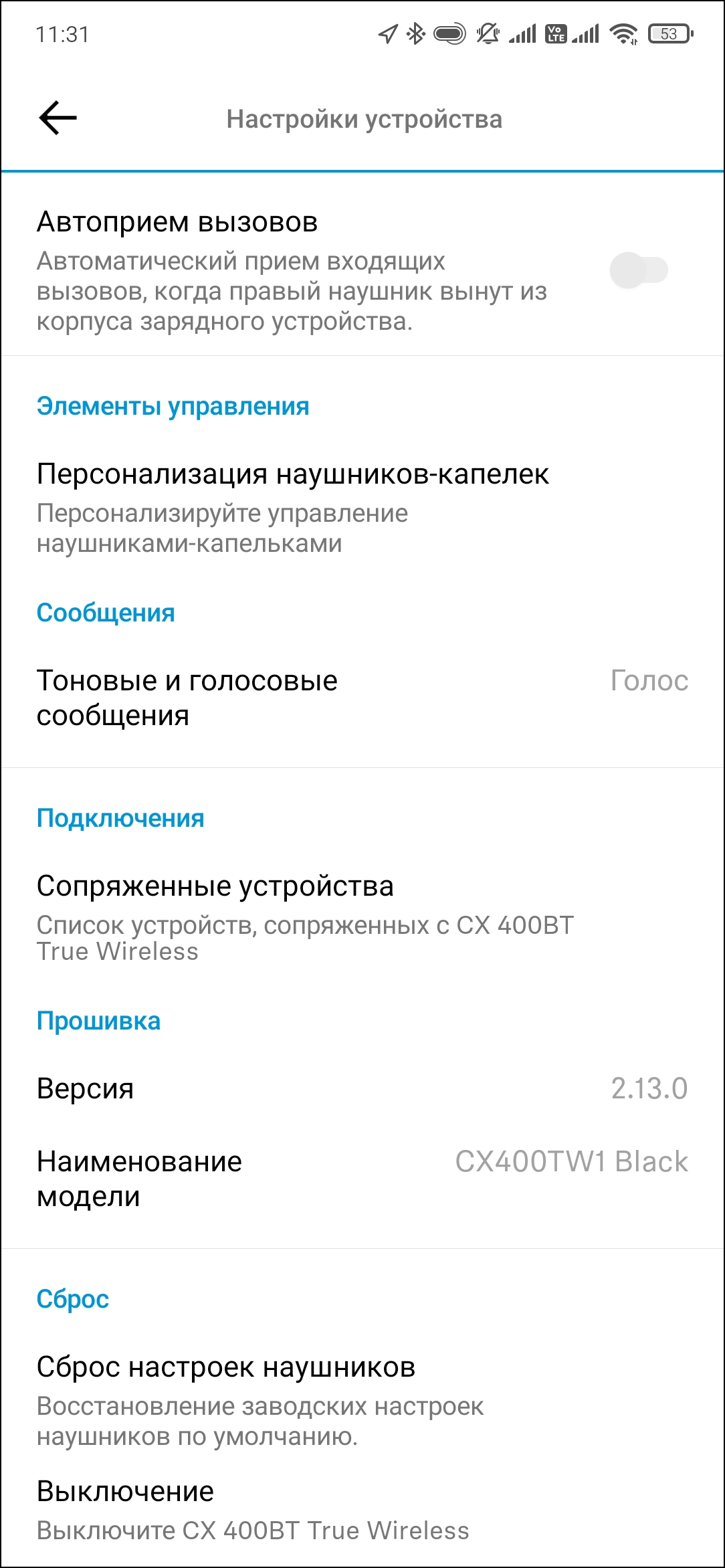 По нажатию иконки в левом верхнем углу появляется меню, в котором можно найти немало полезной информации, а также изменить параметры приложения — в частности, выбрать язык интерфейса. Сразу отметим, что в Smart Control появилась очень интересная и полезная возможность — переключение между источниками. Полноценный мультипойнт она, возможно, и не заменит. Но все равно довольно удобно. В памяти CX 400BT, кстати, сохраняются до восьми ранее подключенных устройств.
