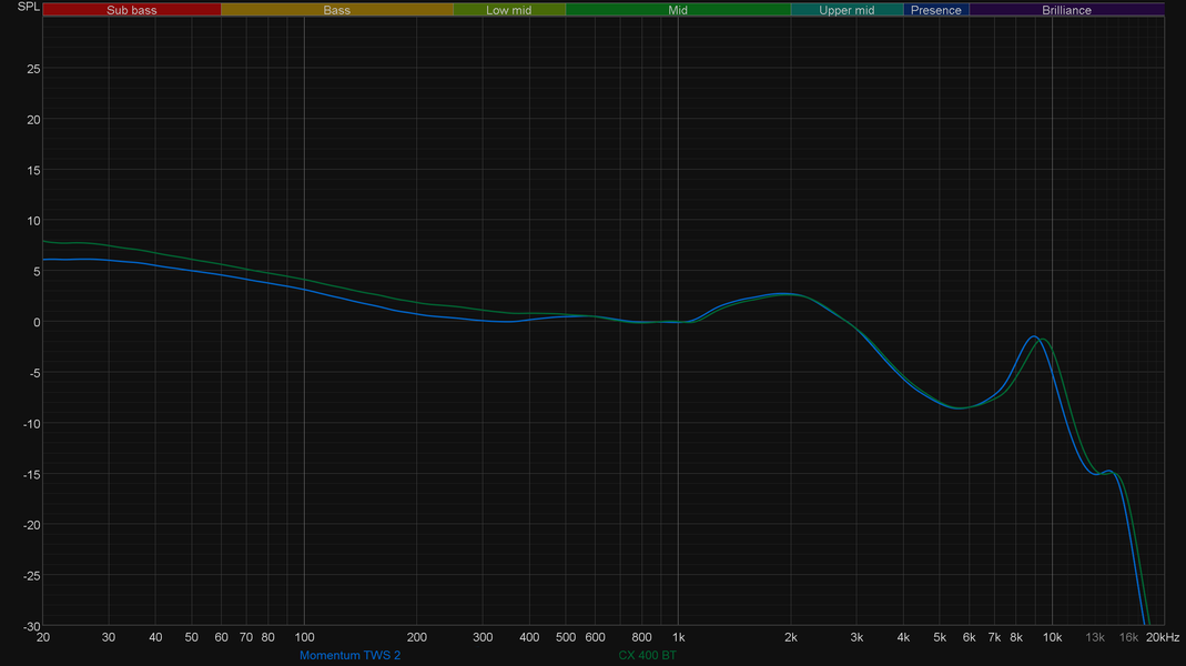 Как уже упоминалось выше, за звук в CX 400BT отвечают те же динамики диаметром 7 мм, что и в Momentum True Wireless 2 — производитель обещает совершенно то же самое звучание, что и в старшей модели. Стоит проверить это утверждение и сравнить графики АЧХ — с этого и начнем.