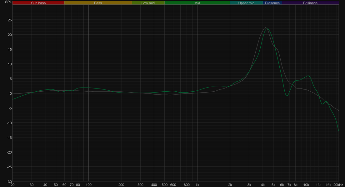 График АЧХ показан на фоне целевой кривой, предоставленной производителем используемого стенда. Она является адаптированным под конкретное устройство аналогом так называемой «кривой Хармана», созданной командой Harman International под руководством доктора Шона Олива. Люди неодинаково воспринимают звук разной частоты, поэтому даже самые точные измерения могут не соответствовать реальному пользовательскому опыту. Для компенсации этих различий и используется целевая АЧХ. Близкое к ней звучание оценивалось сотнями участников экспериментов как нейтральное, сбалансированное, естественное и так далее.