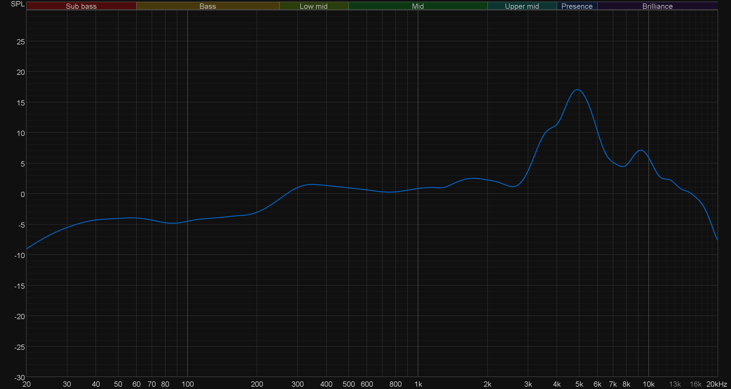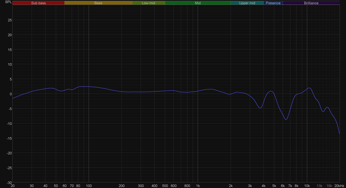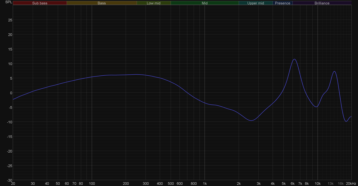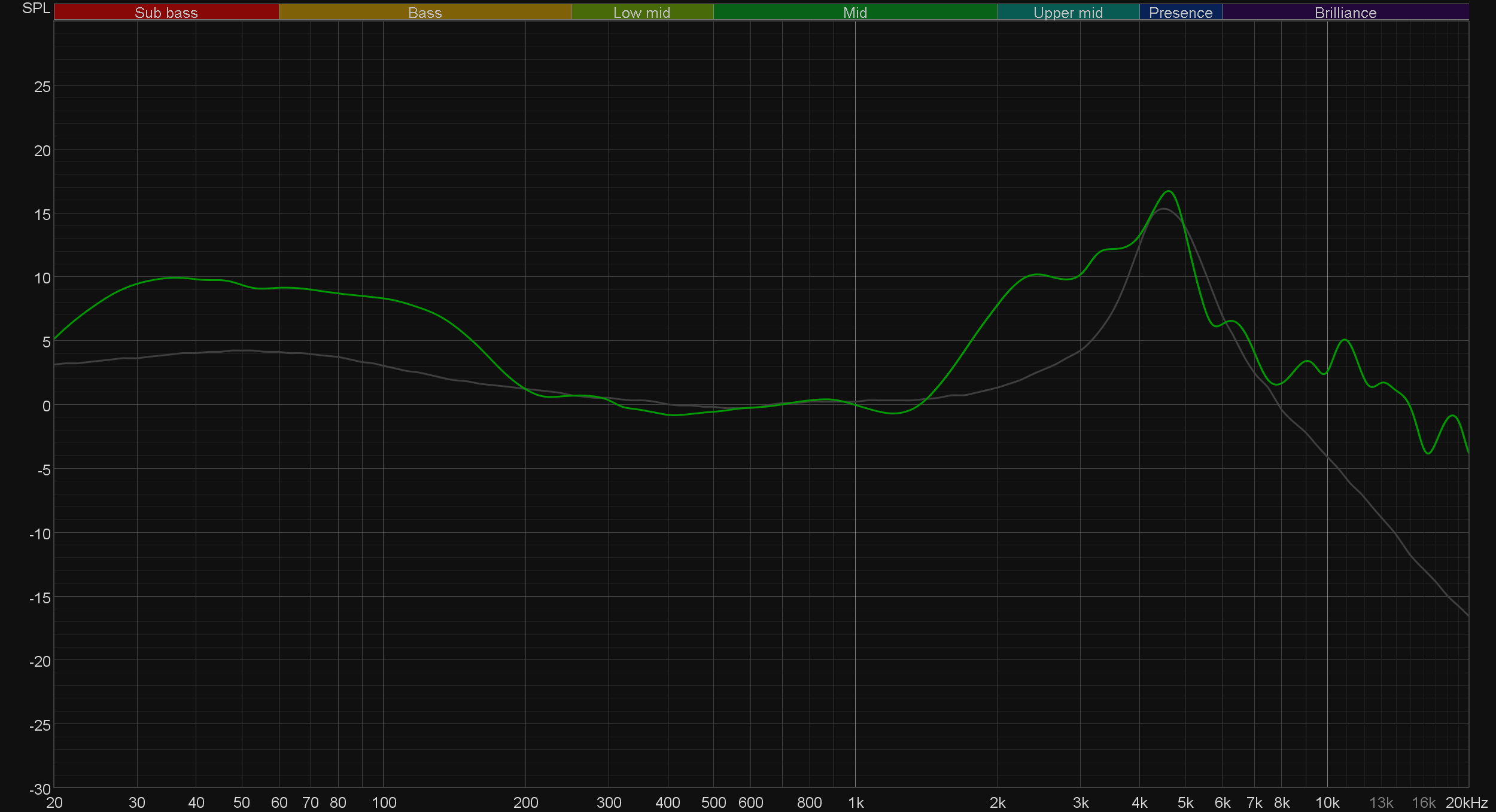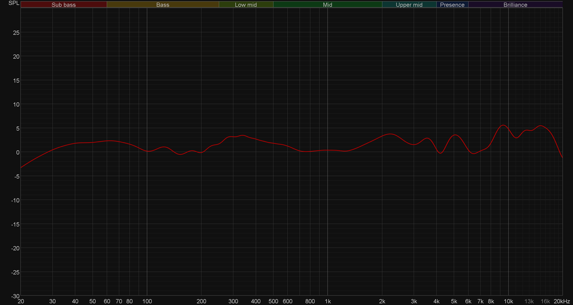 Здесь и дальше график АЧХ показан на фоне целевой кривой, предоставленной производителем используемого стенда. Она является адаптированным под конкретное устройство аналогом так называемой «кривой Хармана», созданной командой Harman International под руководством доктора Шона Олива. Люди неодинаково воспринимают звук разной частоты, поэтому даже самые точные измерения могут не соответствовать реальному пользовательскому опыту. Для компенсации этих различий и используется целевая АЧХ. Близкое к ней звучание оценивалось сотнями участников экспериментов как нейтральное, сбалансированное, естественное и так далее.