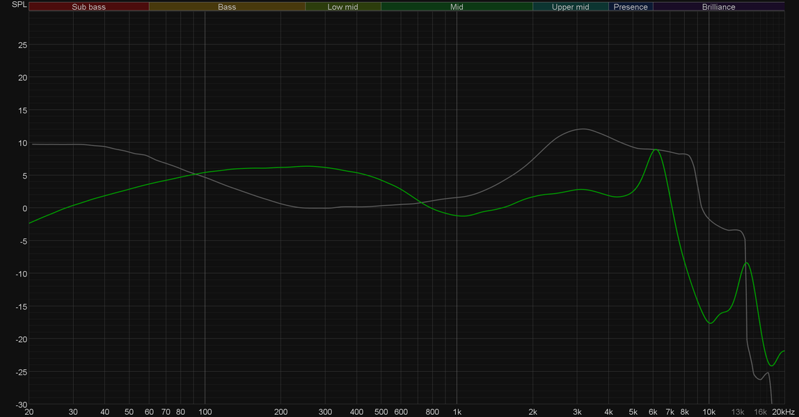 Подчеркнутая верхняя середина дает чуть большую детализацию звучания вокала и солирующих инструментов, но в целом среднечастотный диапазон подается сдержанно. ВЧ-диапазон имеет подъем в районе 6 кГц, что делает звучание более ярким, но при этом не приводит к появлению разнообразных «болезней» этого регистра: «цыкания», «песка» и так далее. На скомпенсированном графике все особенности звучания гарнитуры видны еще более наглядно.