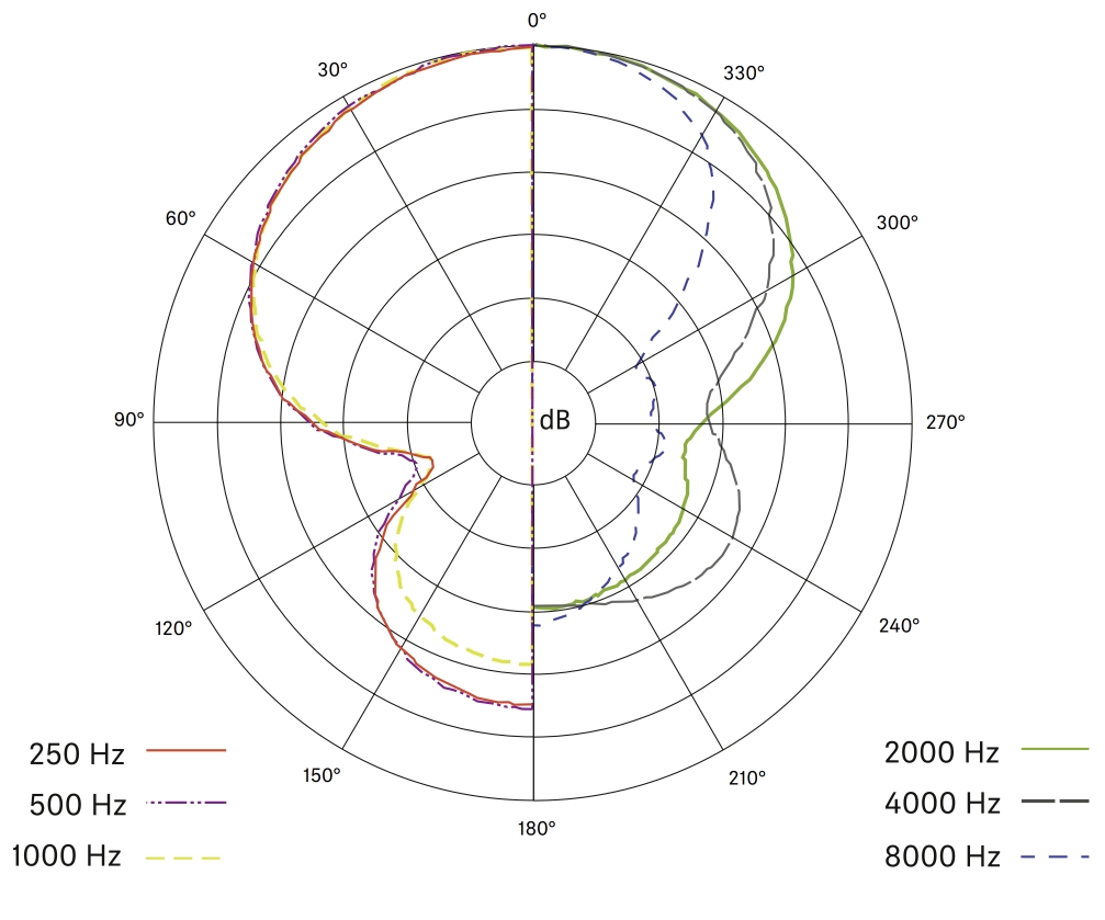 Стоит учитывать, что идущий с боков звук микрофон действительно игнорирует почти полностью, а вот идущий сзади — нет. Соответственно, если оператор вздохнет, шепотом выругается или произведет еще какие-либо звуки, все они окажутся в записи. Ну и не стоит вставать спиной к явным источникам шума — дорогам, например. При съемке в помещении эту особенность тоже стоит учитывать — если оно не имеет акустической обработки, запись может получиться «гулкой» из-за излишней реверберации. Но тут стоит оговориться, что качество звучания все равно будет разительно выше, чем при записи на встроенный микрофон камеры или смартфона. И раз уж заговорили про кардиоидную направленность — посмотрим на соответствующую иллюстрацию от производителя.